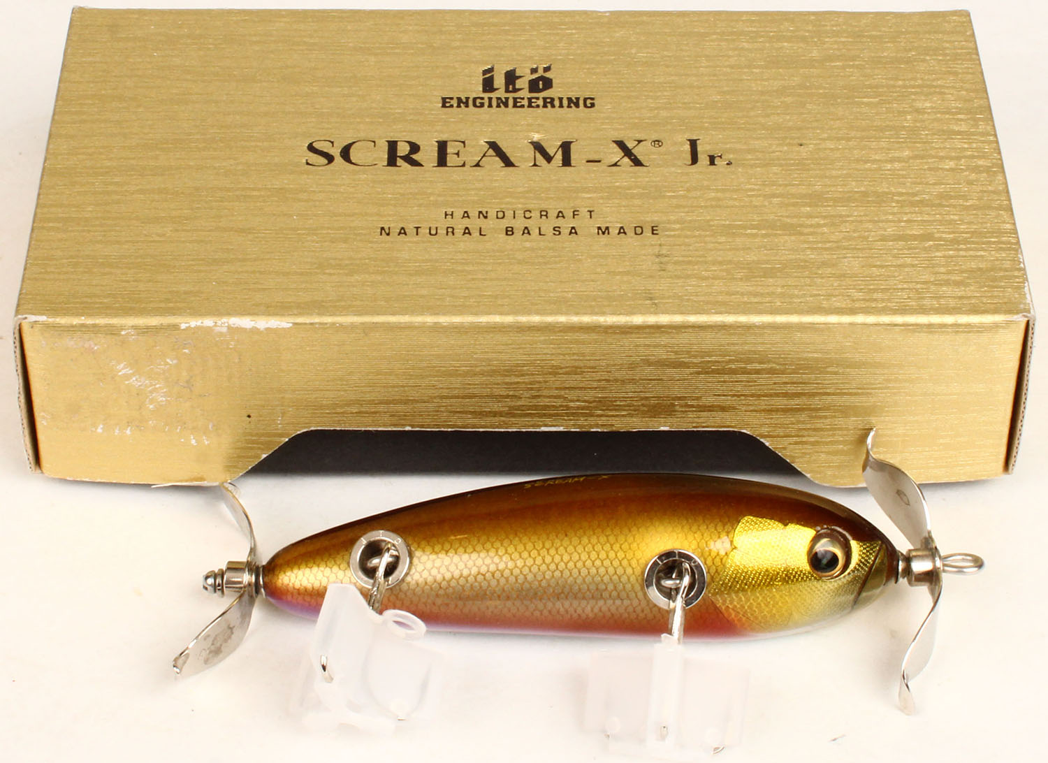 ITO Eng, Scream-X Jr, balsa wood lure, handcrafted CE, gold scale 2 hooks, original box. Grade: MINT - Value: 20 to 80