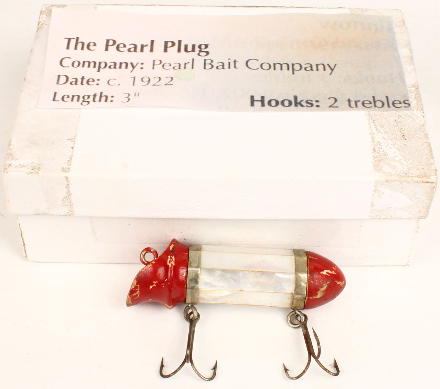 The Pearl Plug Bait Co. lure, mother of pearl strips mounted on side of wood lure, red & head & tail, 2 hooks. Grade: Very Good ++ - Value: 40 to 250