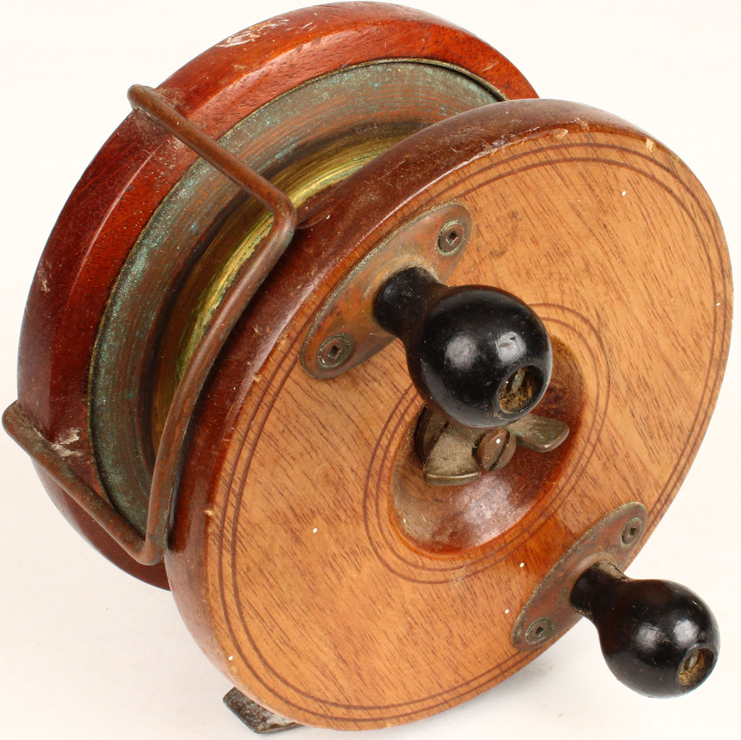 Vintage Peetz Wood Reel, well marked 5'' dia., has brass fixtures with two black wood handles. Grade: Very Good ++ - Value: 20 to 100