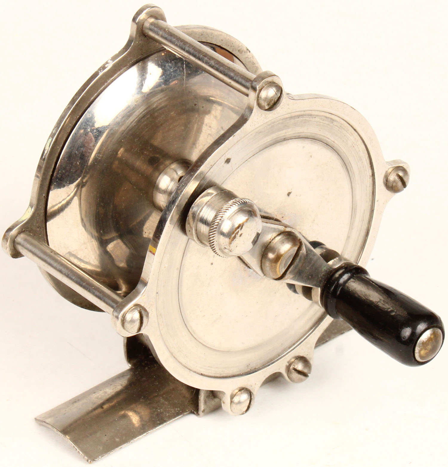 | Unmarked small silver fly reel, 80yd, circa 1910, black handle, ...