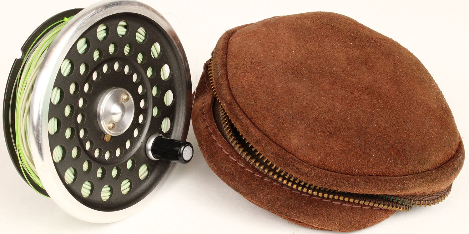 Wulff Fly Spool with leather pouch, 3 1/4''. Grade: Excellent - Value: 6 to 40