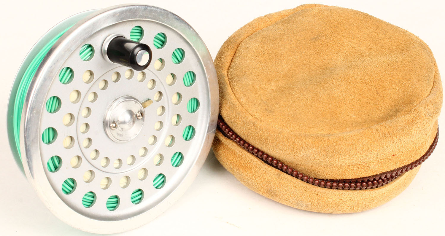 | Unmarked Fly Spool with leather pouch, 3 1/2'' dia. Grade: Ex...