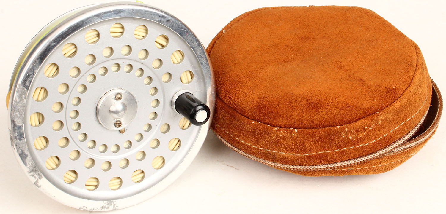 Unmarked Fly Spool with leather pouch, 3 1/8'' dia. Grade: Excellent - Value: 6 to 30