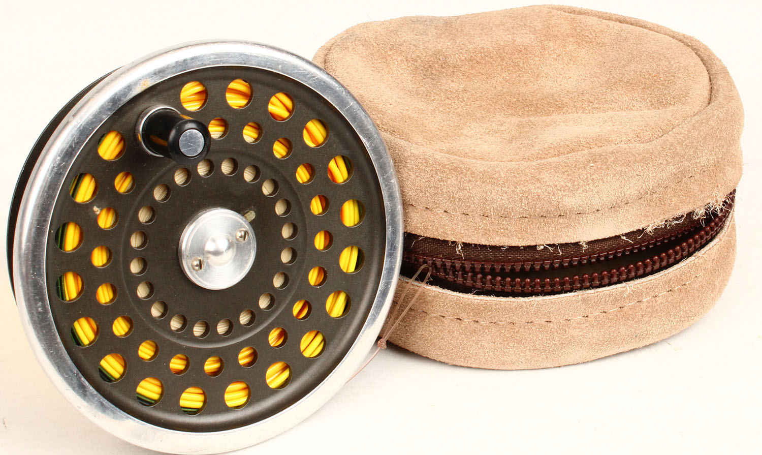 Unmarked Fly Spool with leather pouch, 3 5/8'' dia. Grade: Excellent - Value: 6 to 30