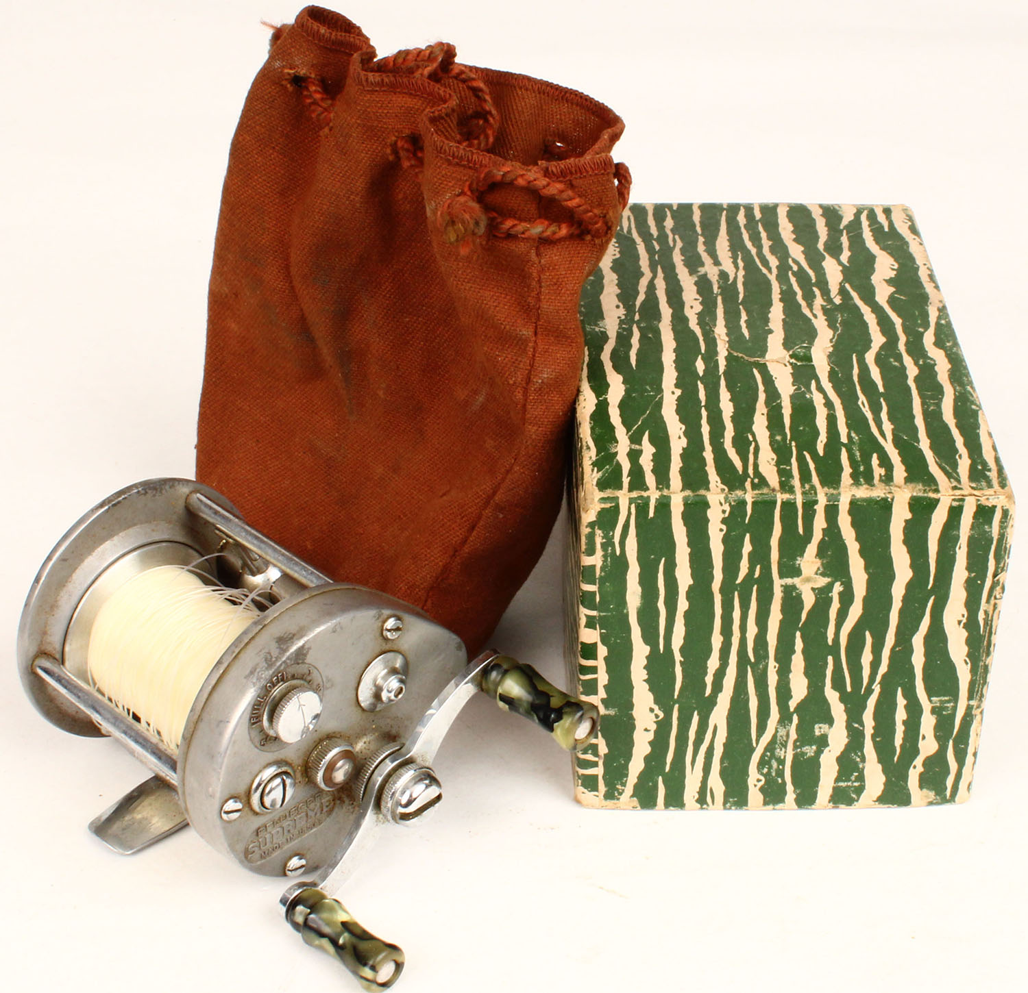 Pflueger Supreme 1573 level wind reel in original box with paperwork, tool, oil, spear parts & leather pouch, strong click. Grade: Excellent - Value: 10 to 50