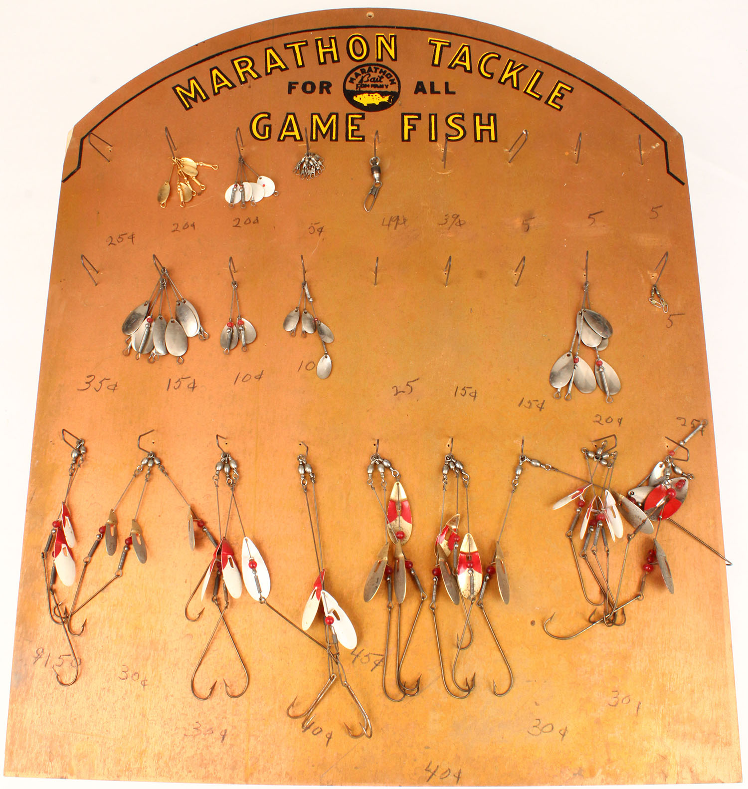 Marathon Tackle Game Fish wood display board with many spinners, 19' x 23''. Grade: Excellent - Value: 40 to 200