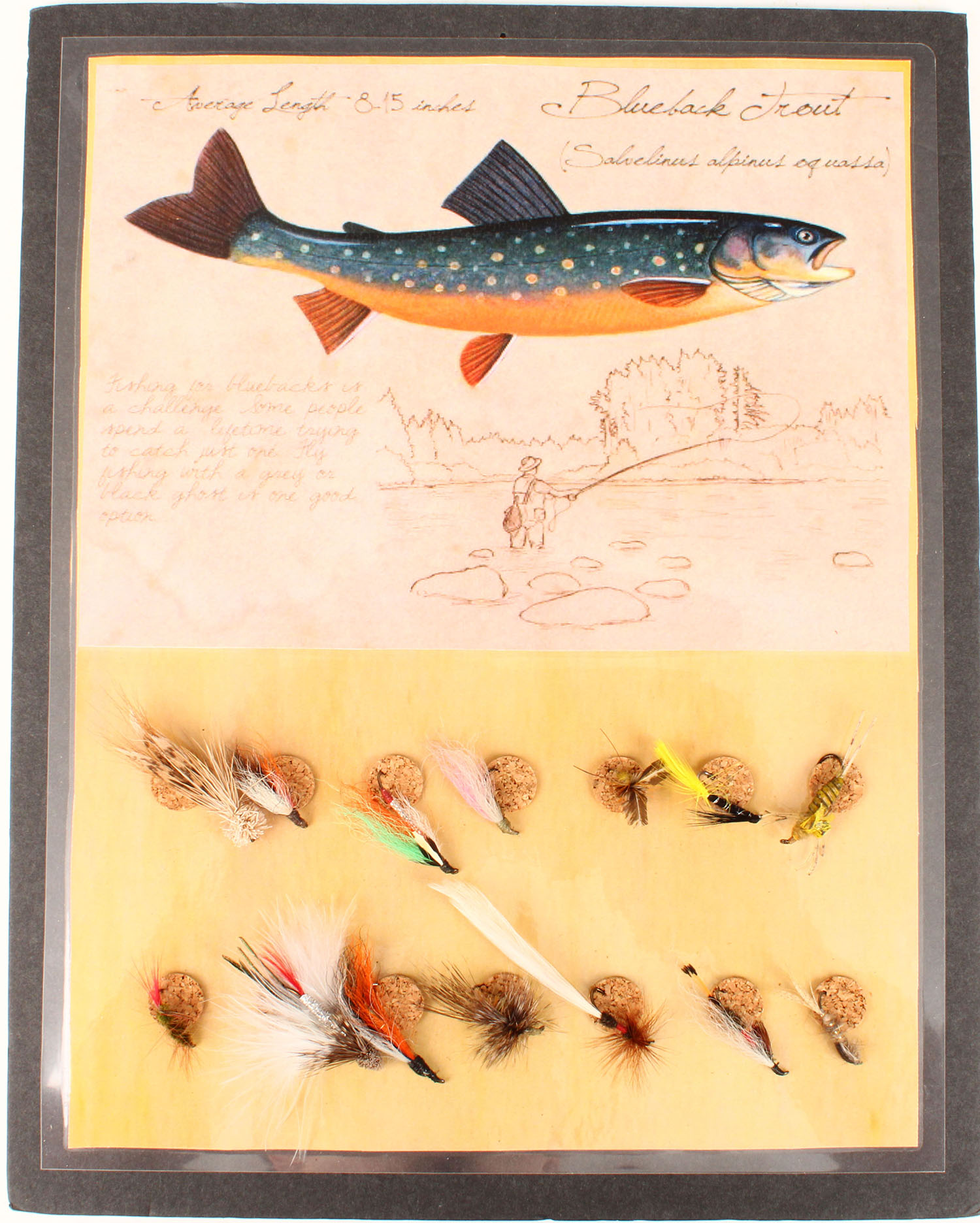 Colorful Fly display with rare blueback trout in full color at top, 8 1/2'' x 11''. Grade: Excellent ++ - Value: 10 to 50