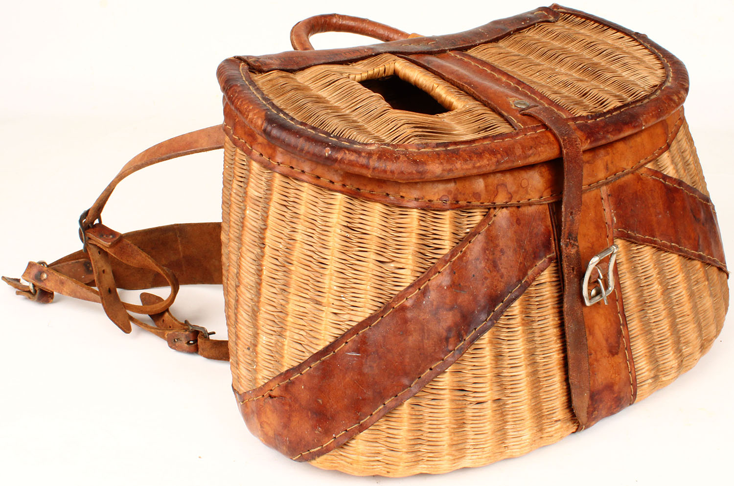 Unmarked Leather creel, buckle is attached with strap, 14'' at base, weave on basket has no damage, leather hanging strap has old repair, nice creel. Grade: Excellent - Value: 20 to 80