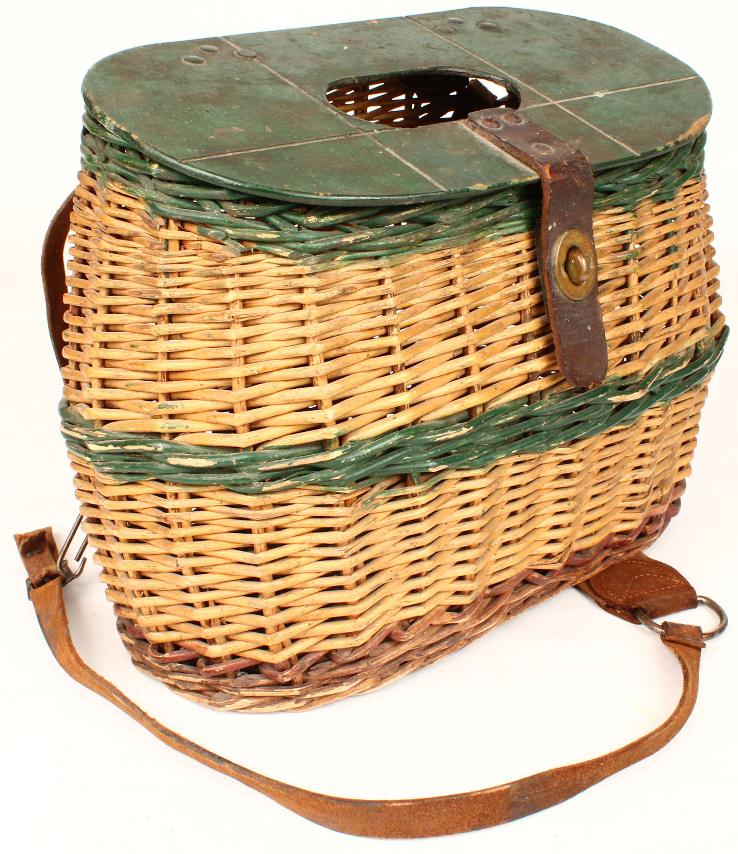| Unmarked Fishing creel, has wood lid, buckle is attached with le...