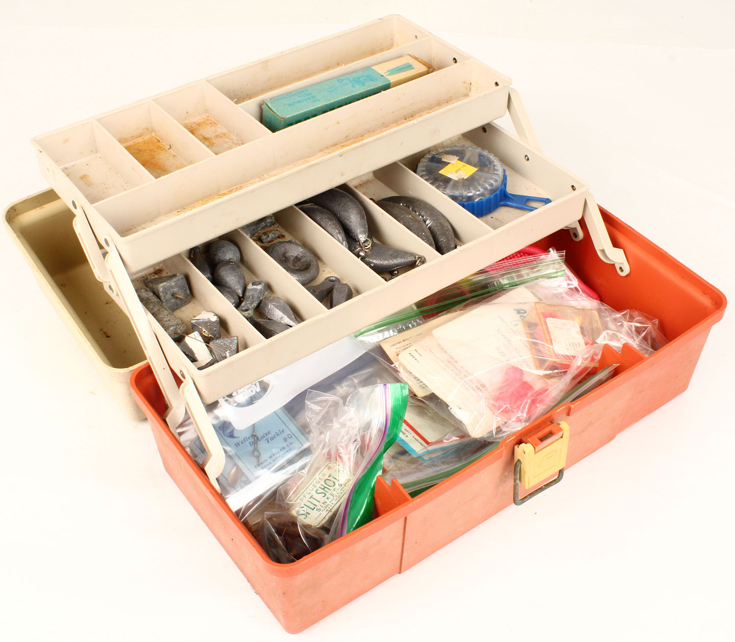 Plano Fishing tackle box full of fishing gear & lures, 13 1/2''. Grade: Excellent - Value: 10 to 40