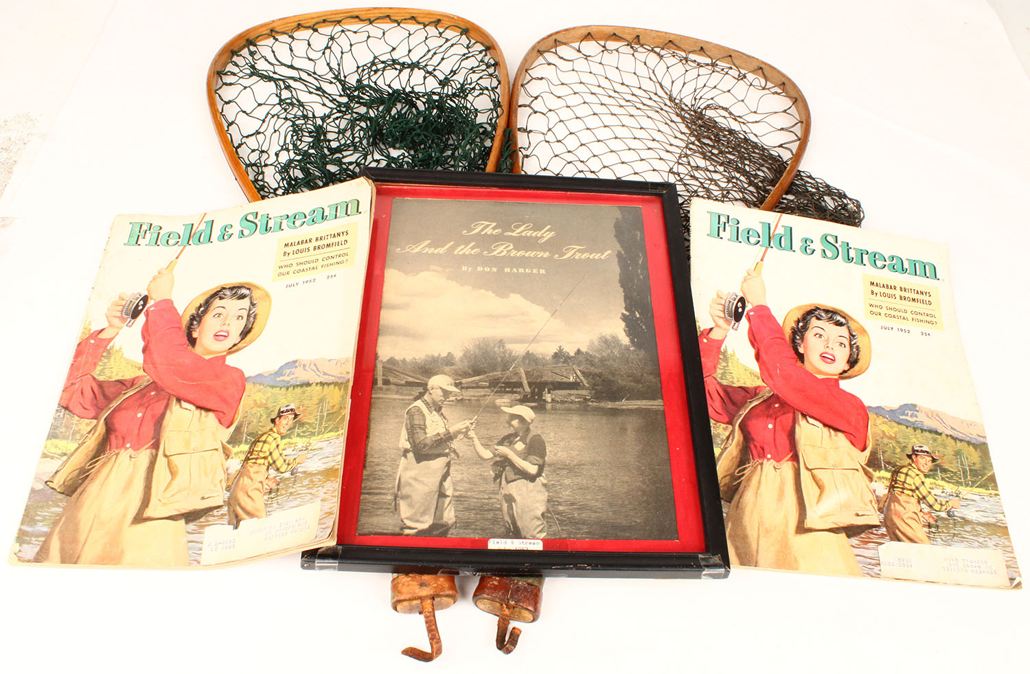 Piece of Fishing History, 1952 Field & Stream did an article on Don & Marge Harger fishing on the famous Deschutes River in Oregon, included are two wood nets one marked Don Harger & one marked Marge, also the original photograph taken of then fishing on the river & two 1952 Field & Stream magazines with them on the front cover. Grade: Excellent - Value: 50 to 500