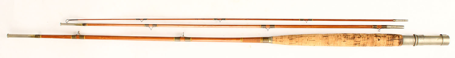 Winchester 3pc. Split bamboo fly rod No. 6087, 8', 5'' has one tip, both mid & tip section are 9'' short, all orignal wrapping, cork handle is nice with some age soiling, well marked on metal butt, highly collectible. Grade: Very Good - Value: 10 to 50