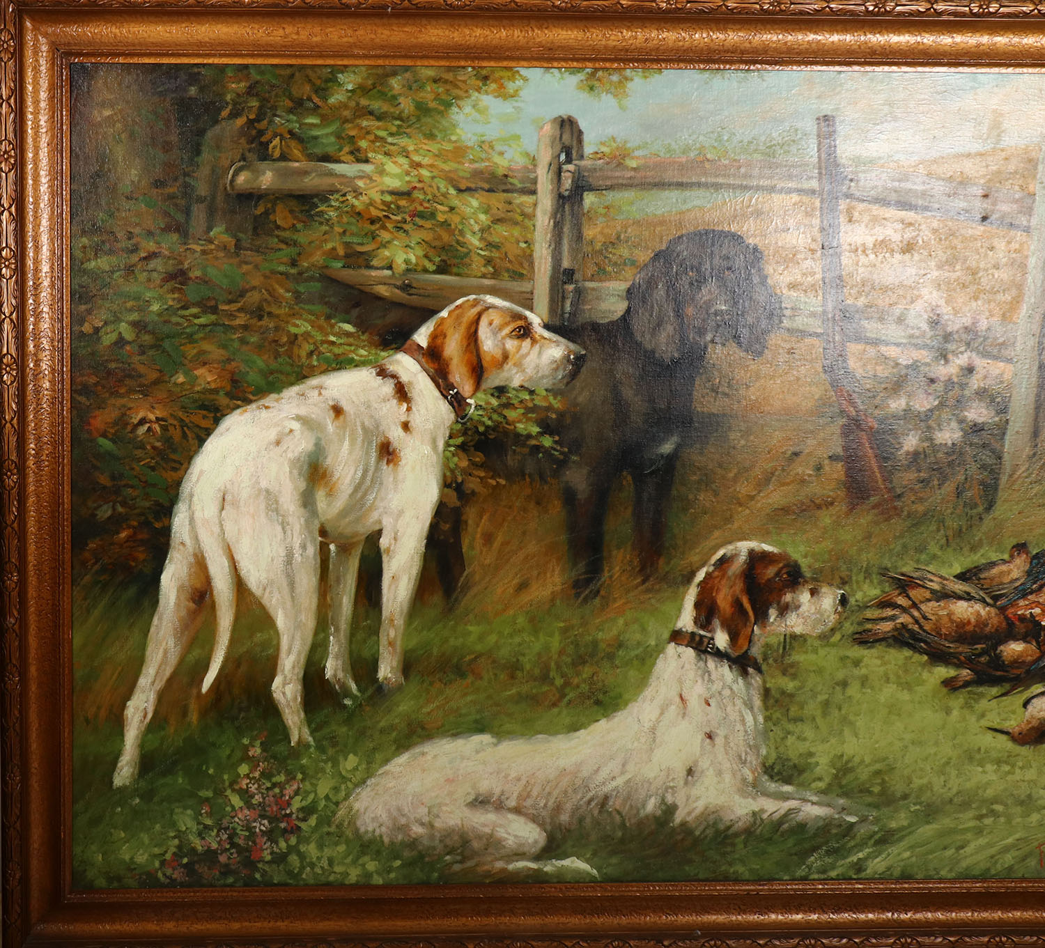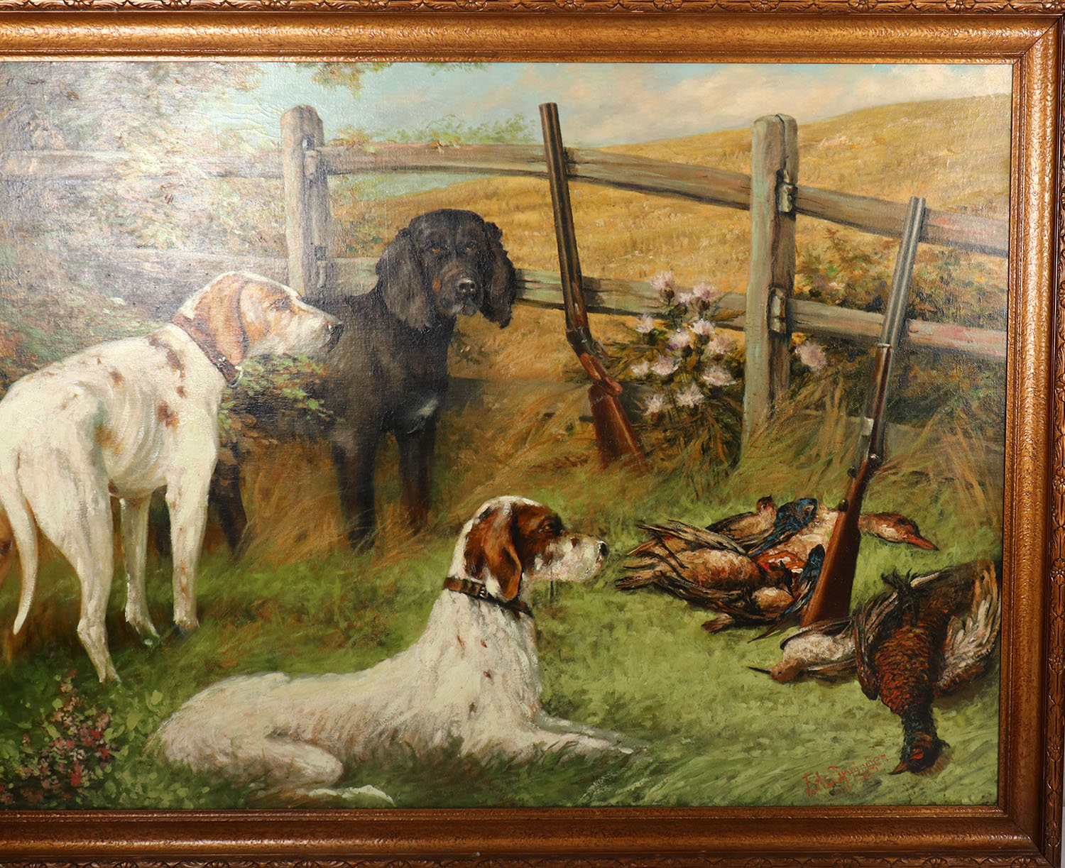 Original Oil on board by F.A. Sprinqer pictures three hunting dogs near fence line with two double shotguns on fence, shows the days success with ducks, woodcocks & rooster pheasant, 6' x 4' image size, VERY LARGE, Exceedingly rare center piece for any man cave/hunting cabin, original frame is thick & well made. Grade: Excellent + - Value: 1000 to 10000