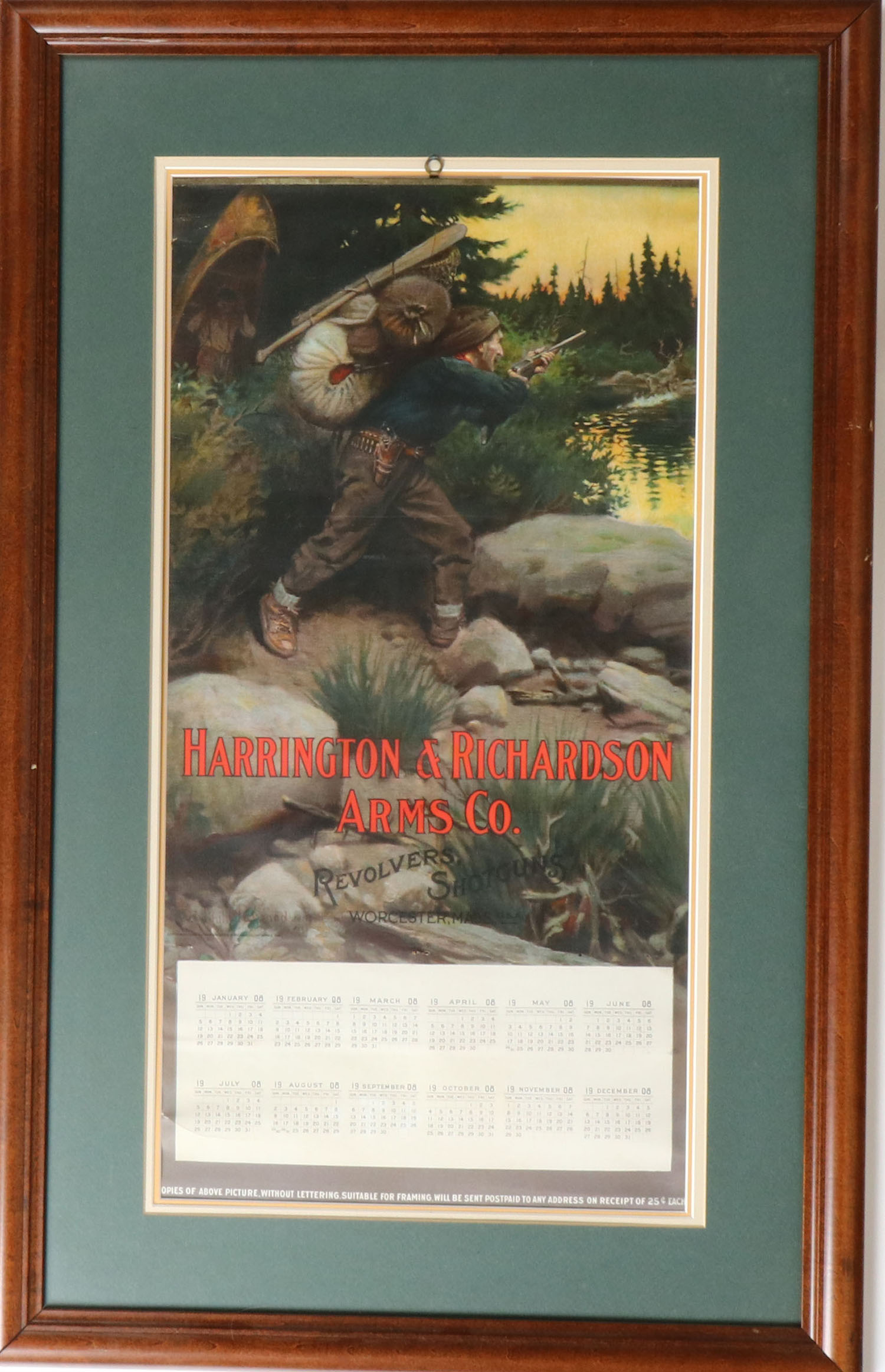 RARE 1908 Harrington & Richardson Arms Co. Calendar by Philip R. Goodwin, pictures hunter with full pack on shooting at a elk on the run with a birch canoe in background, has near perfect colors with red lettering standing out, has metal bands with hanger, no roll wrinkles or edge wear, no pages, 14 1/2'' x 27'', framed & matted, first time we have offered this one. Grade: Excellent ++ - Value: 1000 to 4000