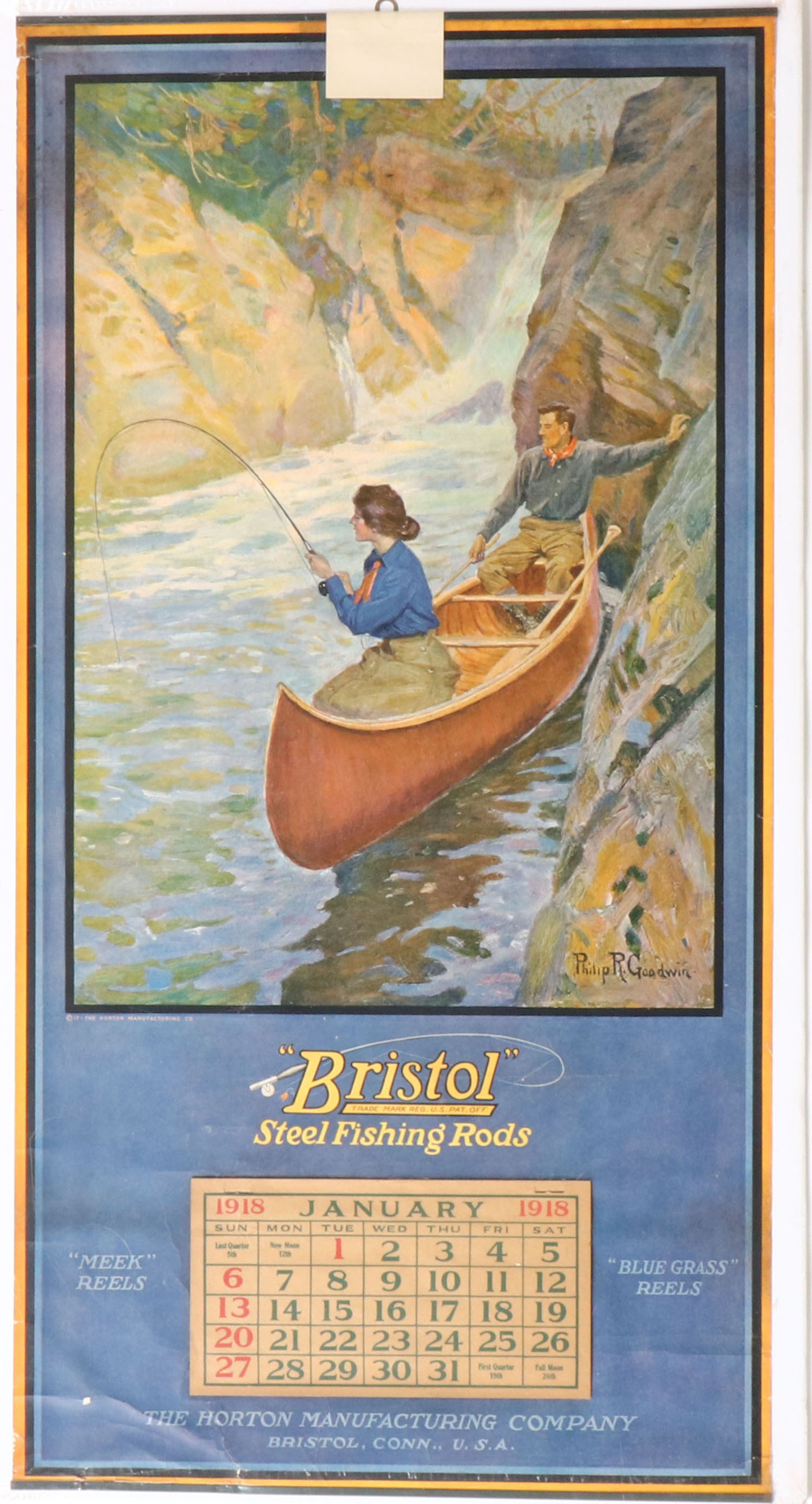 RARE 1918 BRISTOL Calendar by Phillip R Goodwin, pictures wonderful full colored image of man & woman reeling in a fish out of a canoe near water fall, ''MEEK REELS'', ''BLUE GRASS REELS'', has metal bands top & bottom with brass hanger, also has original paper protecter over hanger, Full Pad of Pages, 16'' x 31'', shows almost no edge wear or wrinkles. Grade: Excellent - Value: 1000 to 4000