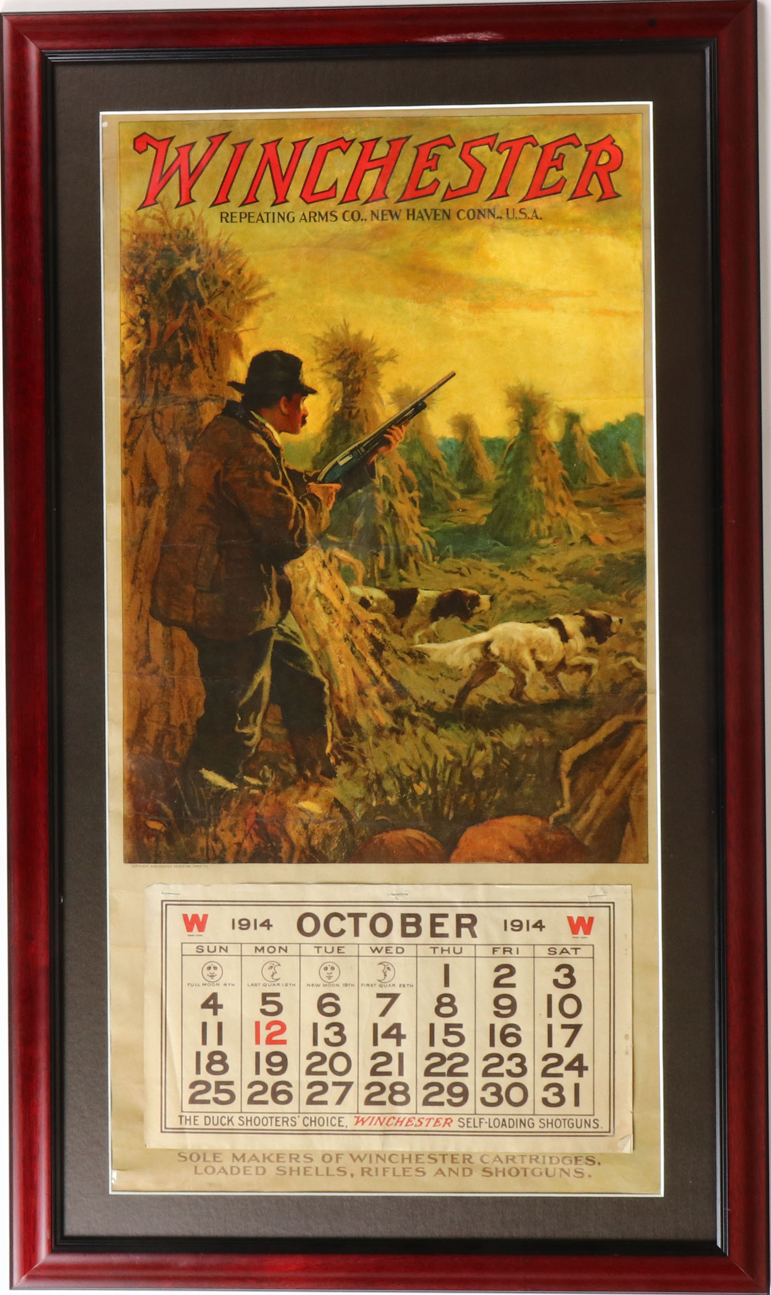 1914 Winchester Calendar pictures early morning upland game hunt with two dogs on point with hunter holding a old model 12 pump shotgun, has a few roll wrinkles, nice edges & color, has bands top & bottom with brass hanger, has Oct-Dec pages, 15 1/2'' x 30'', framed & matted. Grade: Excellent - Value: 1000 to 4000