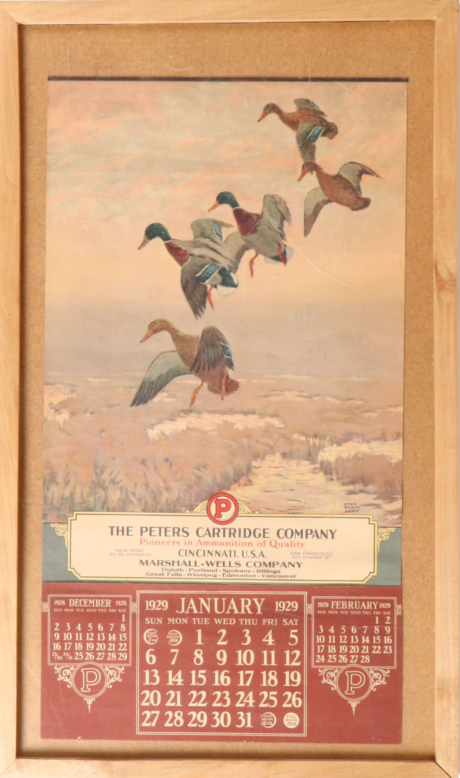 1929 Peters calendar by Lynn Bogue Hunt, pictures close up image of mallards setting into marsh grass below, has great colors, has metal band with brass hanger, full pad of pages, 15'' x 27 1/2''. Has almost no wear with great edges. Grade: Excellent ++ - Value: 1000 to 3000