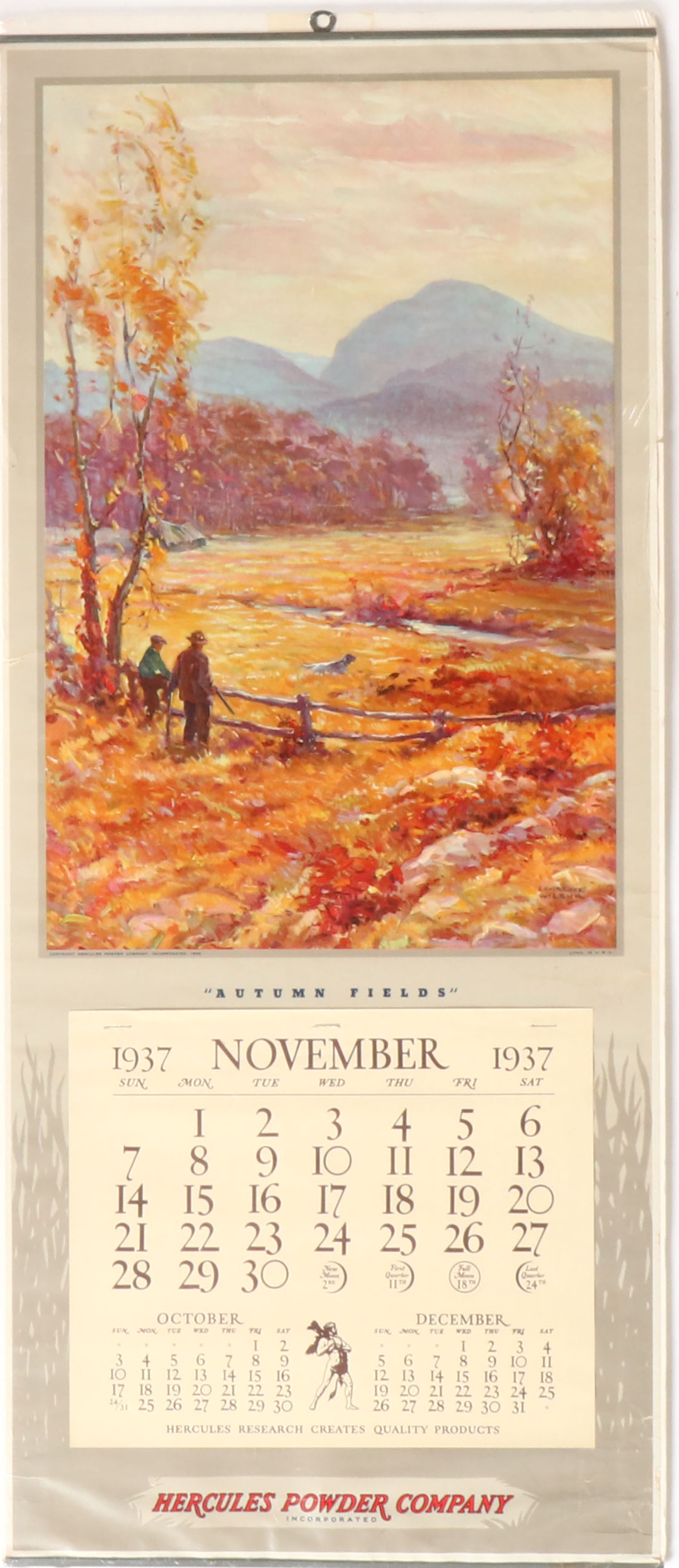 1937 Hercules calendar, ''AUTUMN FIELDS'', pictures father & son upland bird hunting with dog on point, has metal bands top & bottom with brass hanger, nov page, has great colors with very minor edge wear, 13'' x 30 1/4''. Grade: Excellent - Value: 100 to 400