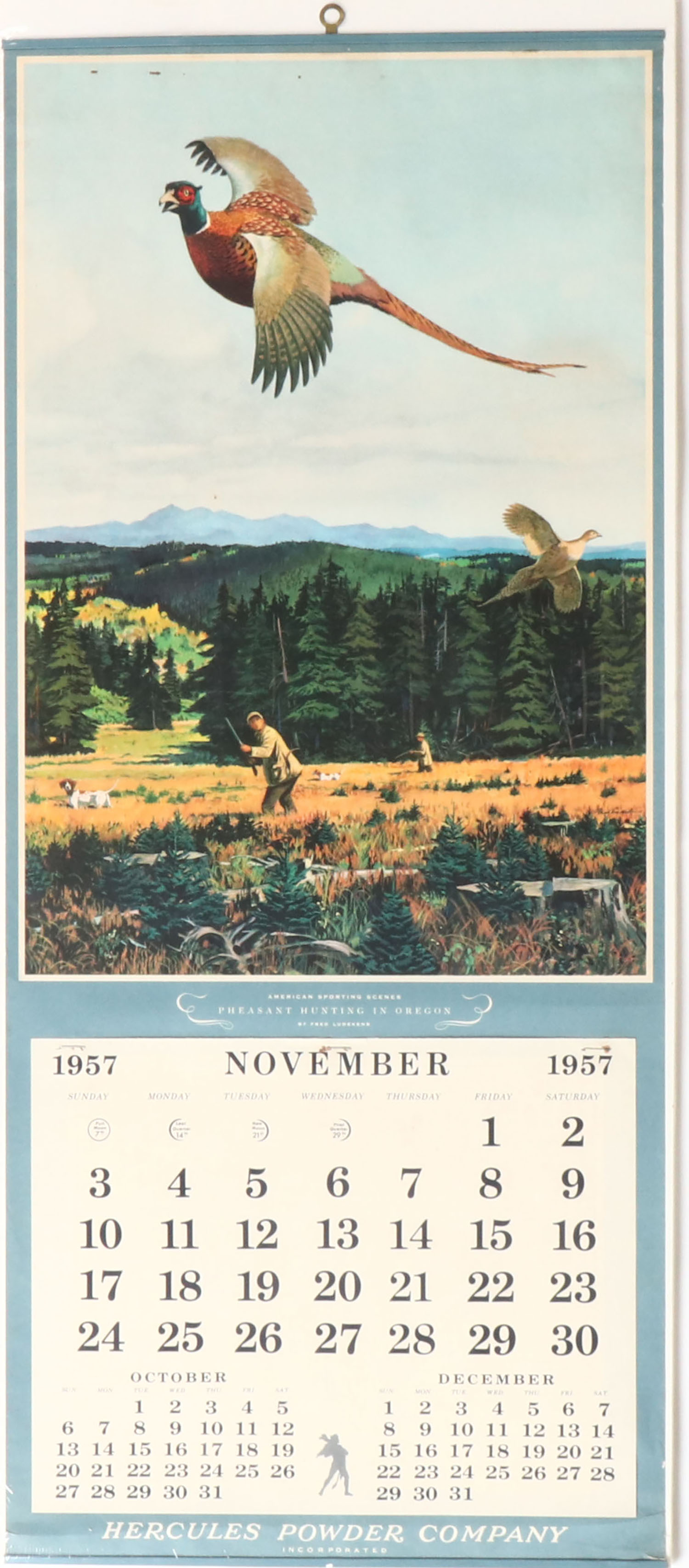 1957 Hercules calendar, ''Pheasant Hunting in Oregon'', pictures two hunters pheasant hunting with dogs on point & birds in the air, has metal bands top & bottom with brass hanger, nov page, has great colors with no wear, 13'' x 30 1/4''. Grade: Excellent ++ - Value: 100 to 300