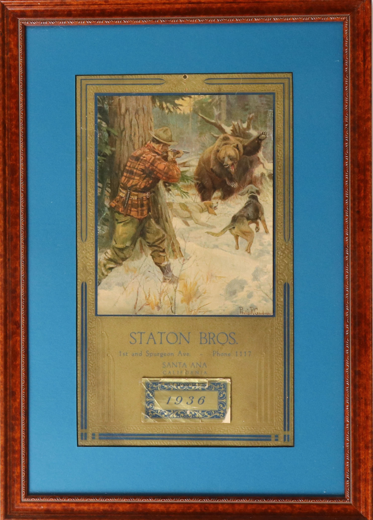 1936 Philip R Goodwin calendar, pictures hunter in snow scene shooting a grizzly bear, full pad of pages, 10'' x 17'' image size, framed. Grade: Excellent - Value: 100 to 300