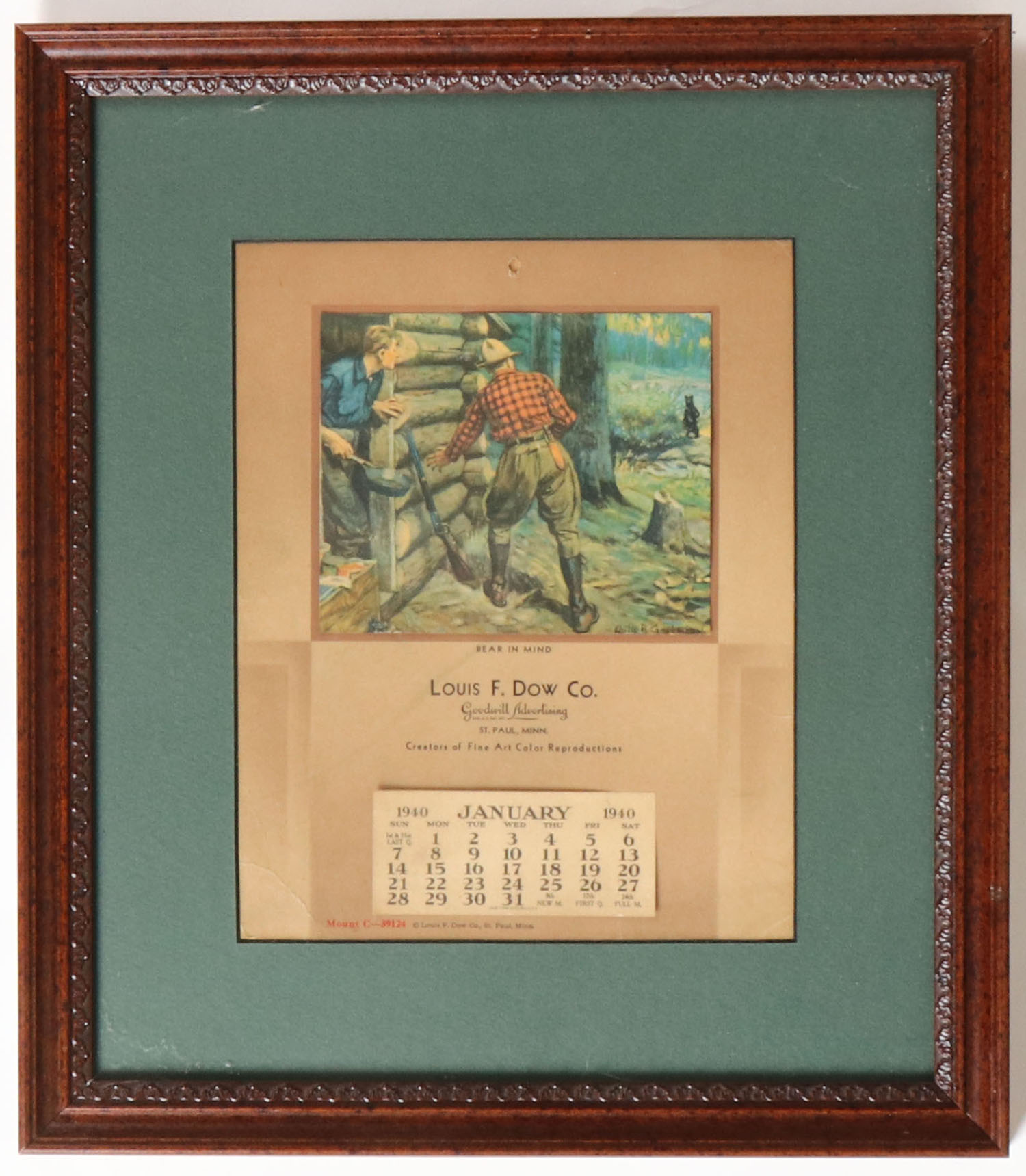 1940 Philip R Goodwin calendar, pictures man & wife in log cabin with bear on approach, 8'' x 10'' image size, framed. Grade: Excellent - Value: 50 to 300