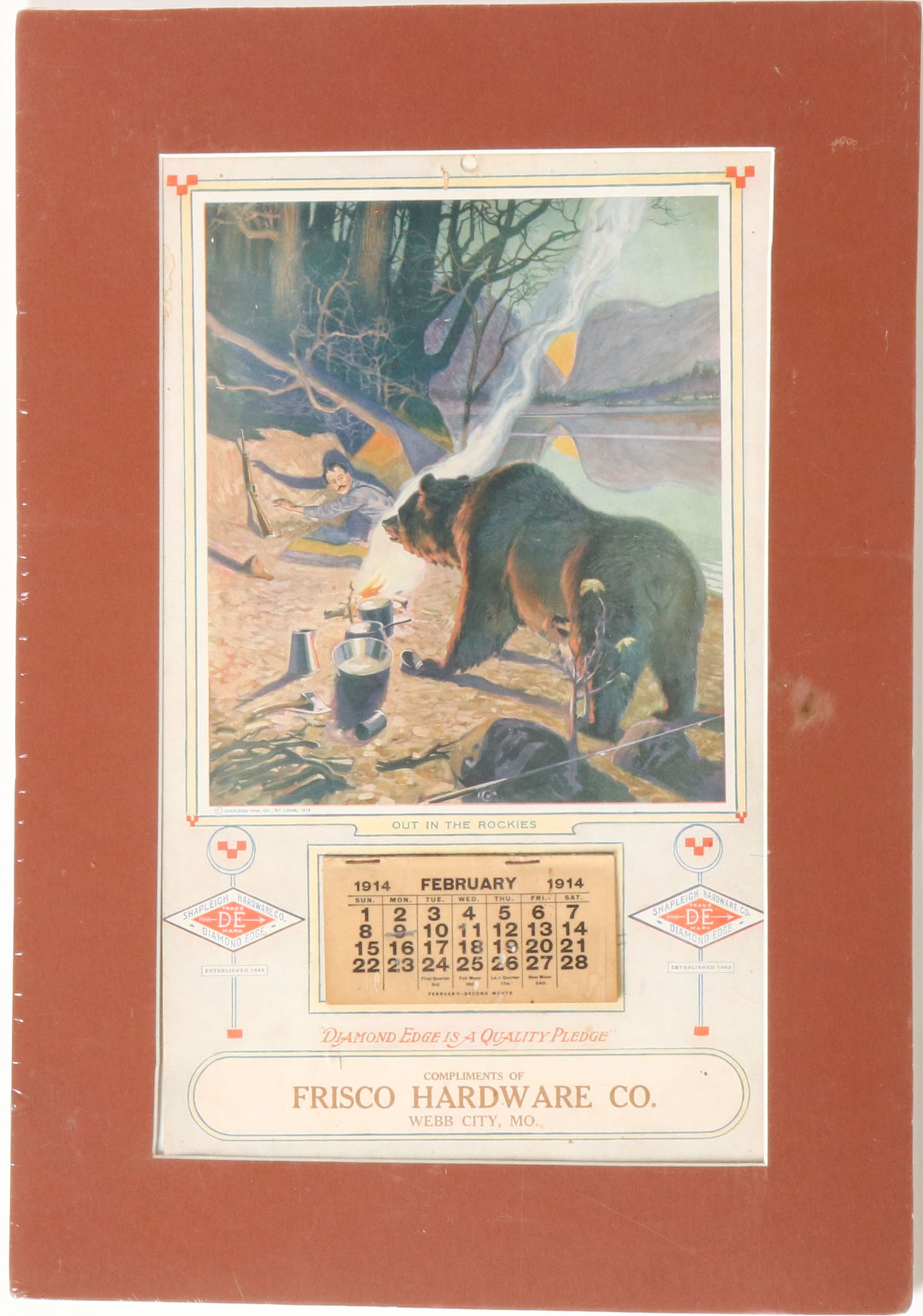 1914 Shapleigh Hardware Co. calendar ''OUT IN THE ROCKIES'', Pictures grizzly bear coming into camp, full pad of pages, 9'' x 14 1/2'' matted. Grade: Excellent - Value: 20 to 100