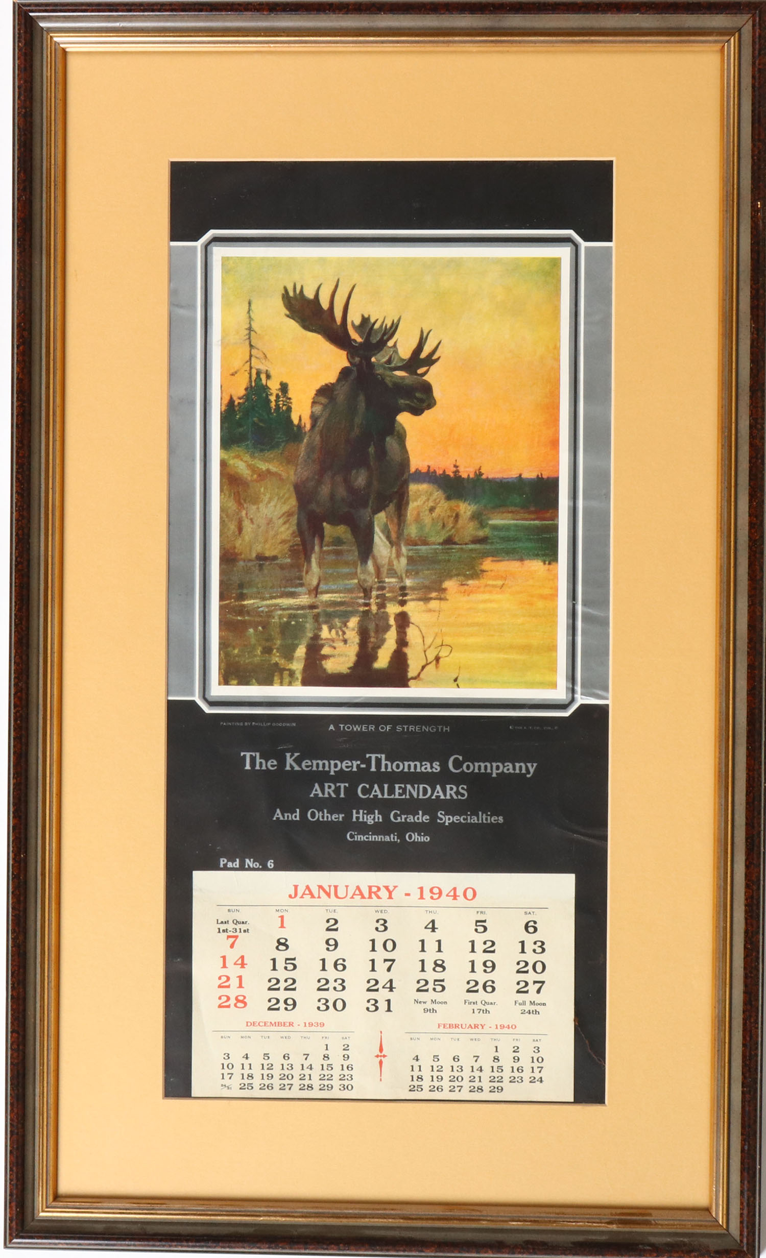 1940 Philip R Goodwin calendar ''A Tower of Strength'', pictures bull moose in water, jan. page, framed & matted, 10'' x 21''. Grade: Excellent - Value: 50 to 200