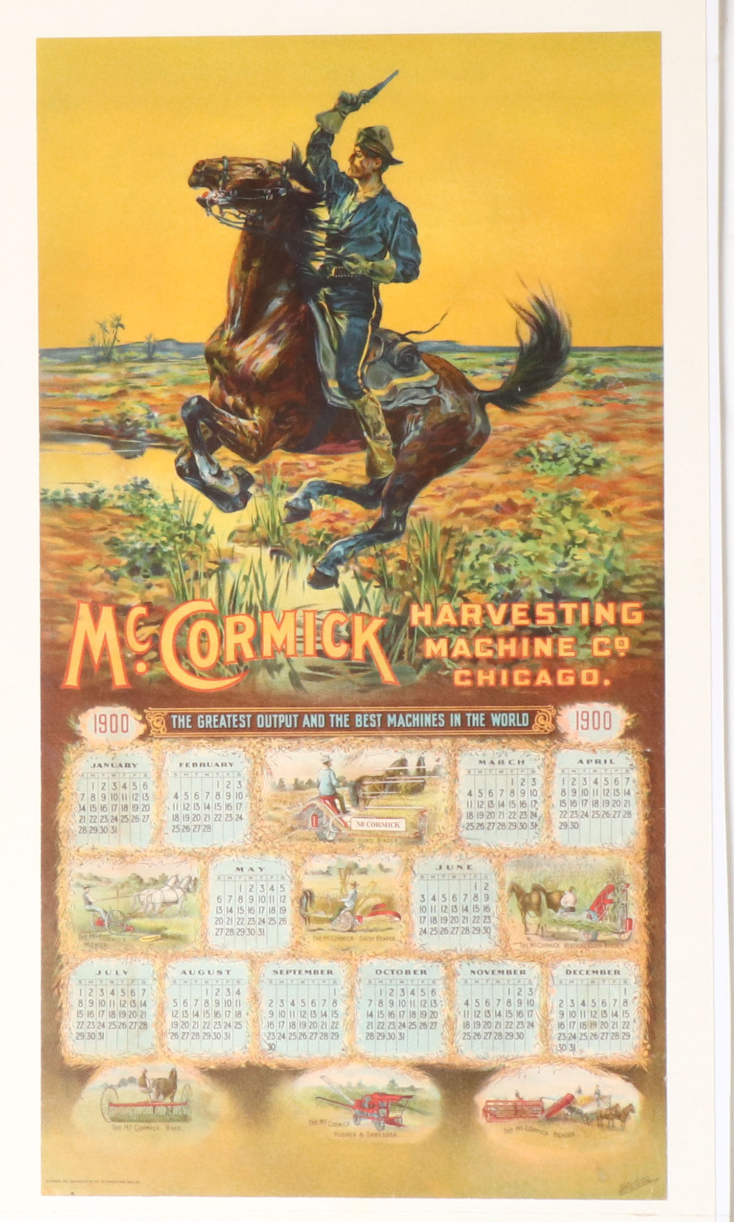 1900 McCormick Harvesting Machine Co calendar, pictures a solider on horseback with a pistol, many other images on bottom, 13 3/4'' x 25 1/2''. Grade: Excellent ++ - Value: 10 to 100