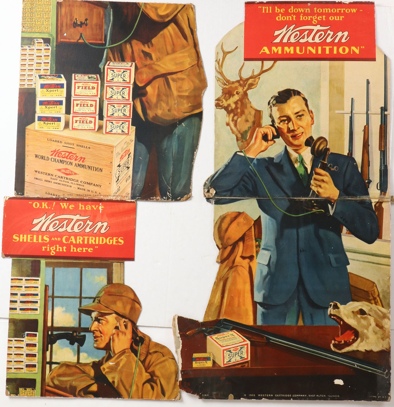 Western Cart. Co. Diecut, pictures two fiends talking on phone, one at the hunting cabin & one at the office, missing center piece, originally there was a green cord that connected the two phones & each panel has a hole for that cord to into, each piece is 20 1/2'' x 43'', box show edge wear & tears at the folds, still nice colors, many ammo boxes are pictured. Grade: Very Good ++ - Value: 800 to 2500