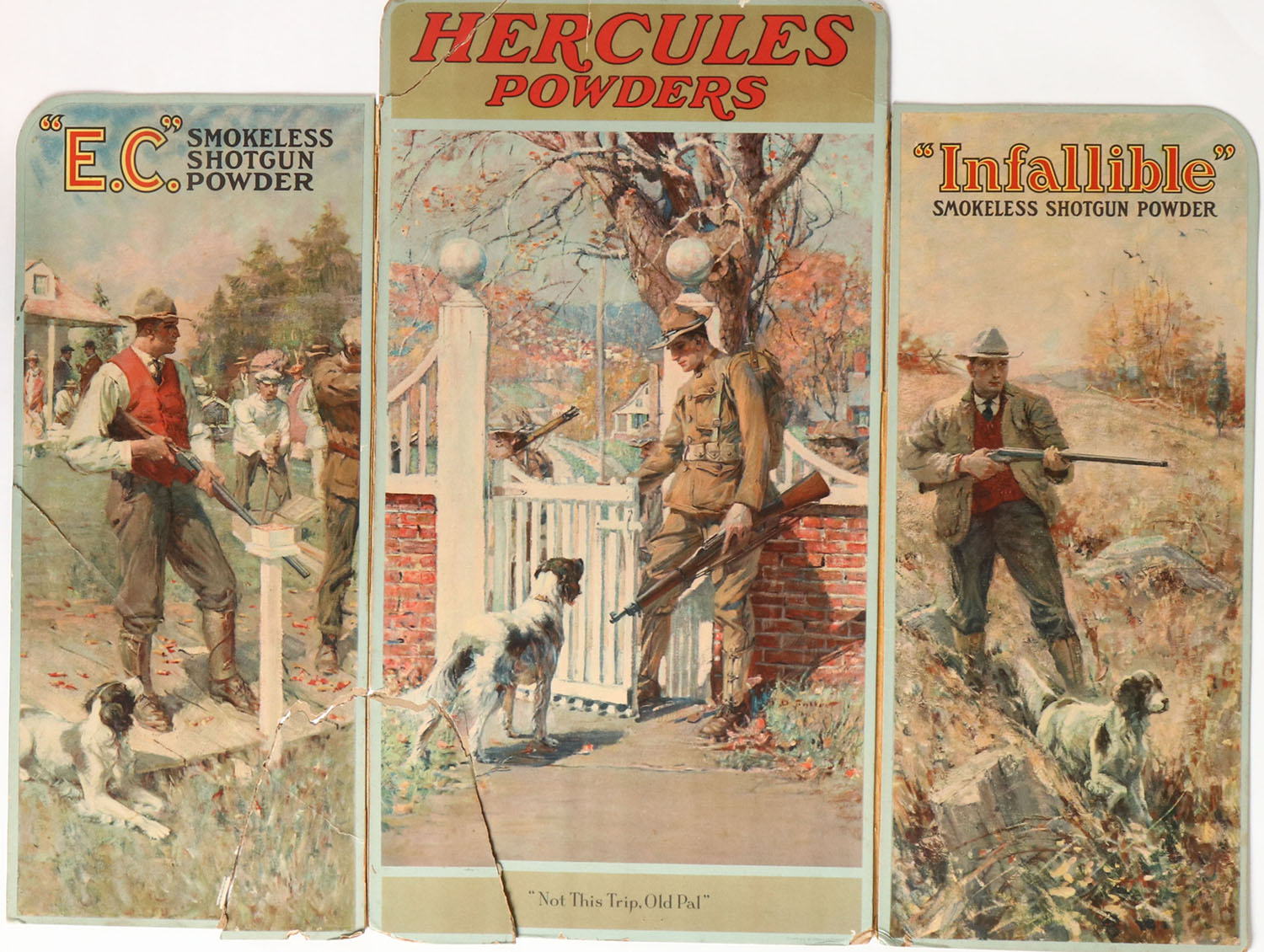 Hercules Powder Co. 3 panel diecut, has three different scenes, nice colors but shows some creases & a piece has come loose at bottom center, 31 1/2'' x 24'', hard to find. Grade: Very Good - Value: 500 to 2000