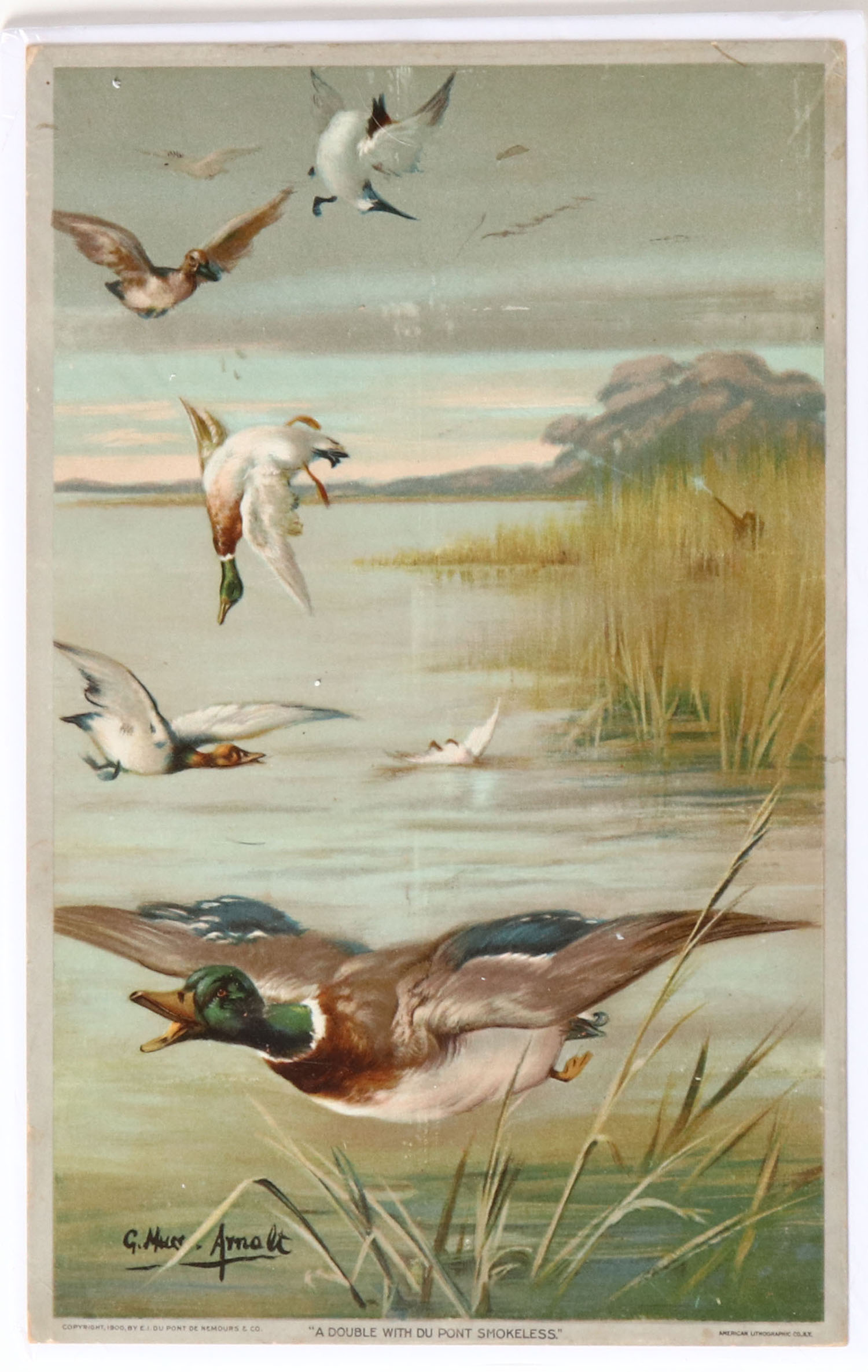 Dupont shotshell crate insert by G. Muss Arnolt, pictures a great full color image of mallards with hunter in background, ''A DOUBLE WITH DU PONT SHOKELESS'', dated 1900, 8 1/2'' x 13 1/2''., almost no wear. Grade: Excellent ++ - Value: 100 to 600