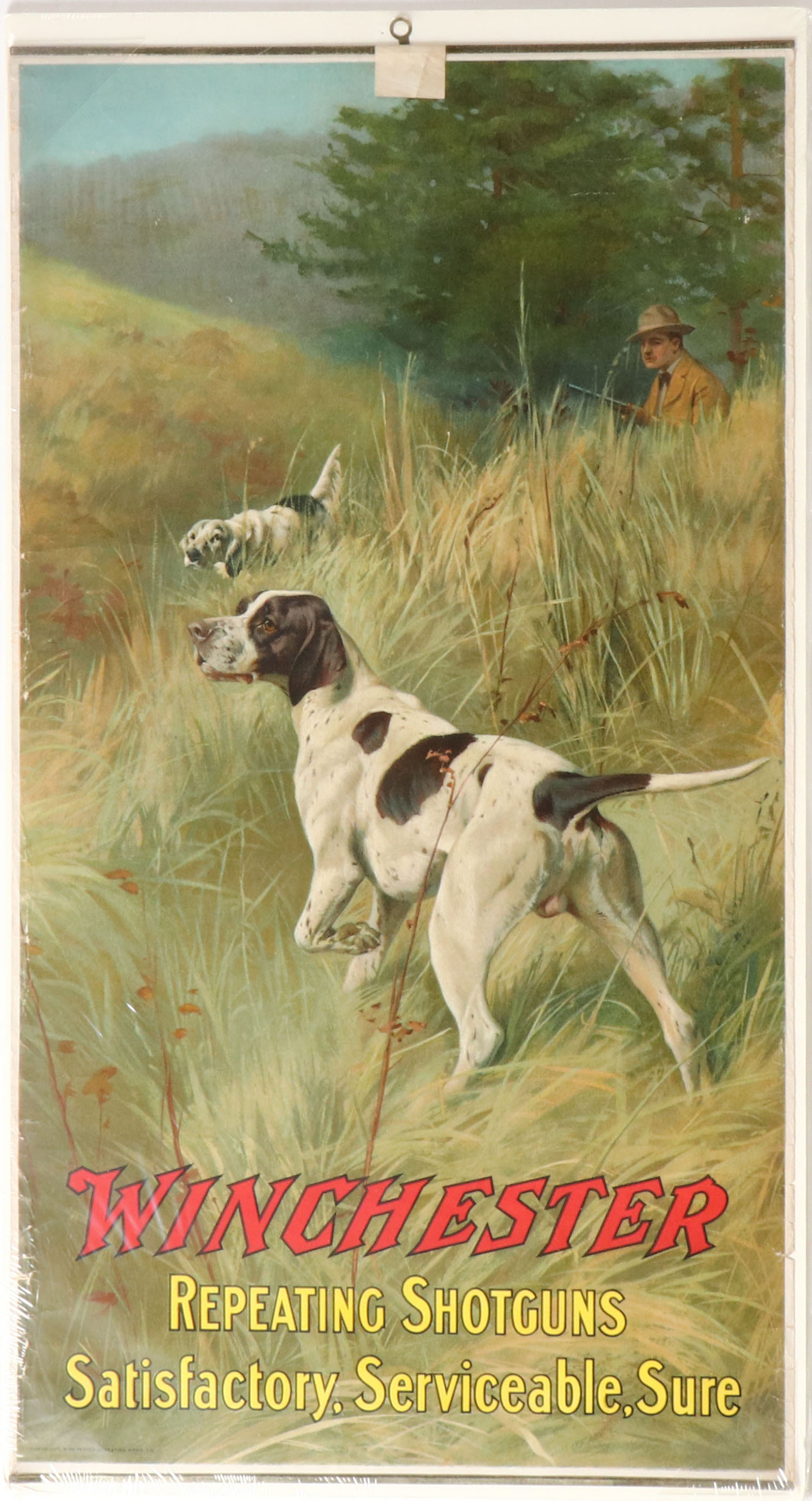 Winchester Poster, ''WINCHESTER REPEATING SHOTGUNS - SATISFACTORY, SERVICEABLE, SURE'', has great full color image of hunter & two dogs on point, has metal bands top & bottom with brass hanger, 16 1/2'' x 30 1/2'', has no roll wrinkles with fantastic colors that is very bright, light edge wear, Very Attractive piece that is very hard to find! Grade: Excellent + - Value: 2000 to 4000