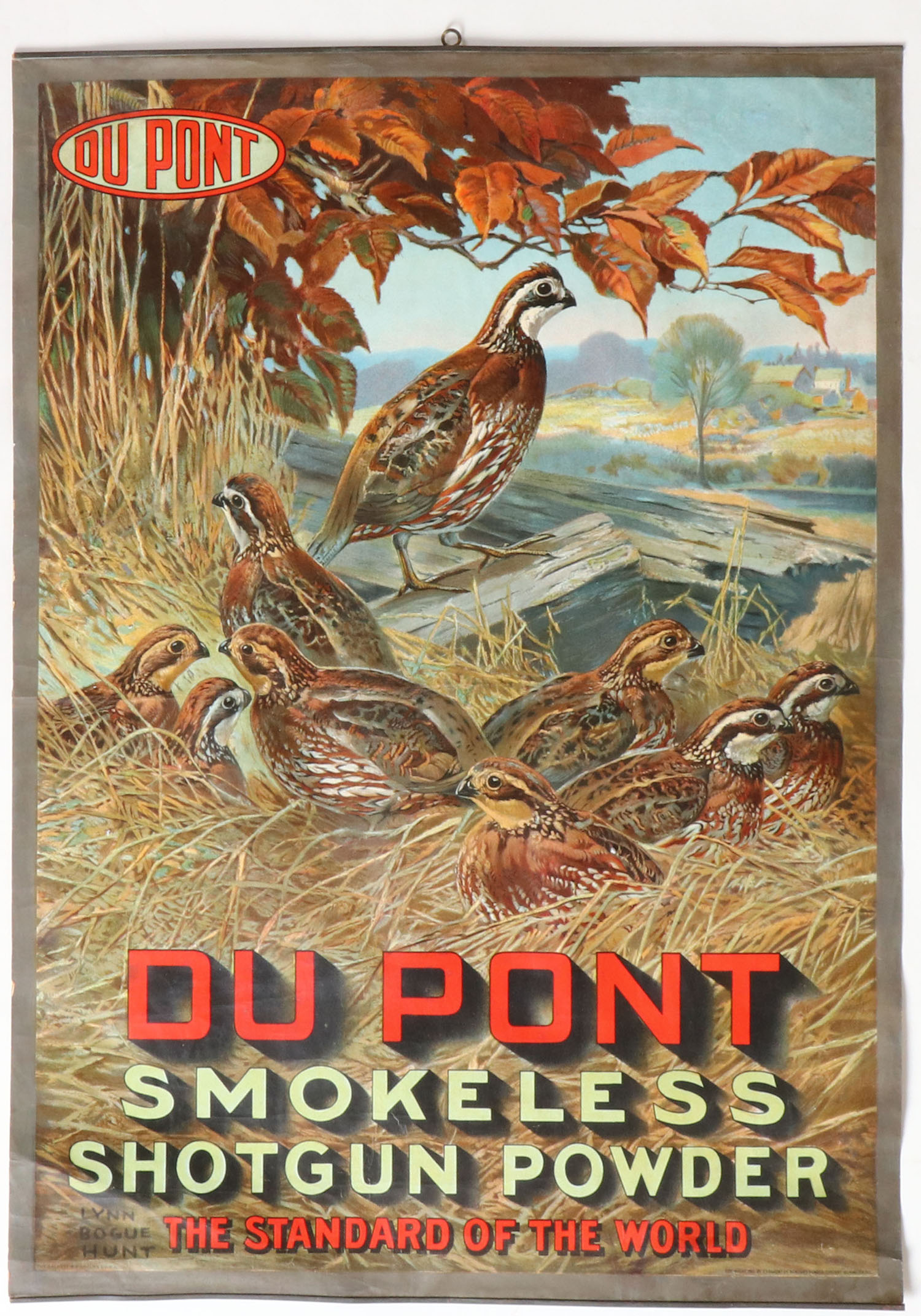 RARE 1913 DU PONT Poster pictures a fantastic full color image of covey of quail in grass, ''DU PONT SMOKELESS SHOTGUN POWDER THE STANDARD OF THE WORLD'', has metal bands top & bottom with brass hanger, has just a few minor professional touch ups to edges otherwise all original with great colors, 21'' x 29 3/4''. Grade: Excellent + - Value: 2000 to 5000