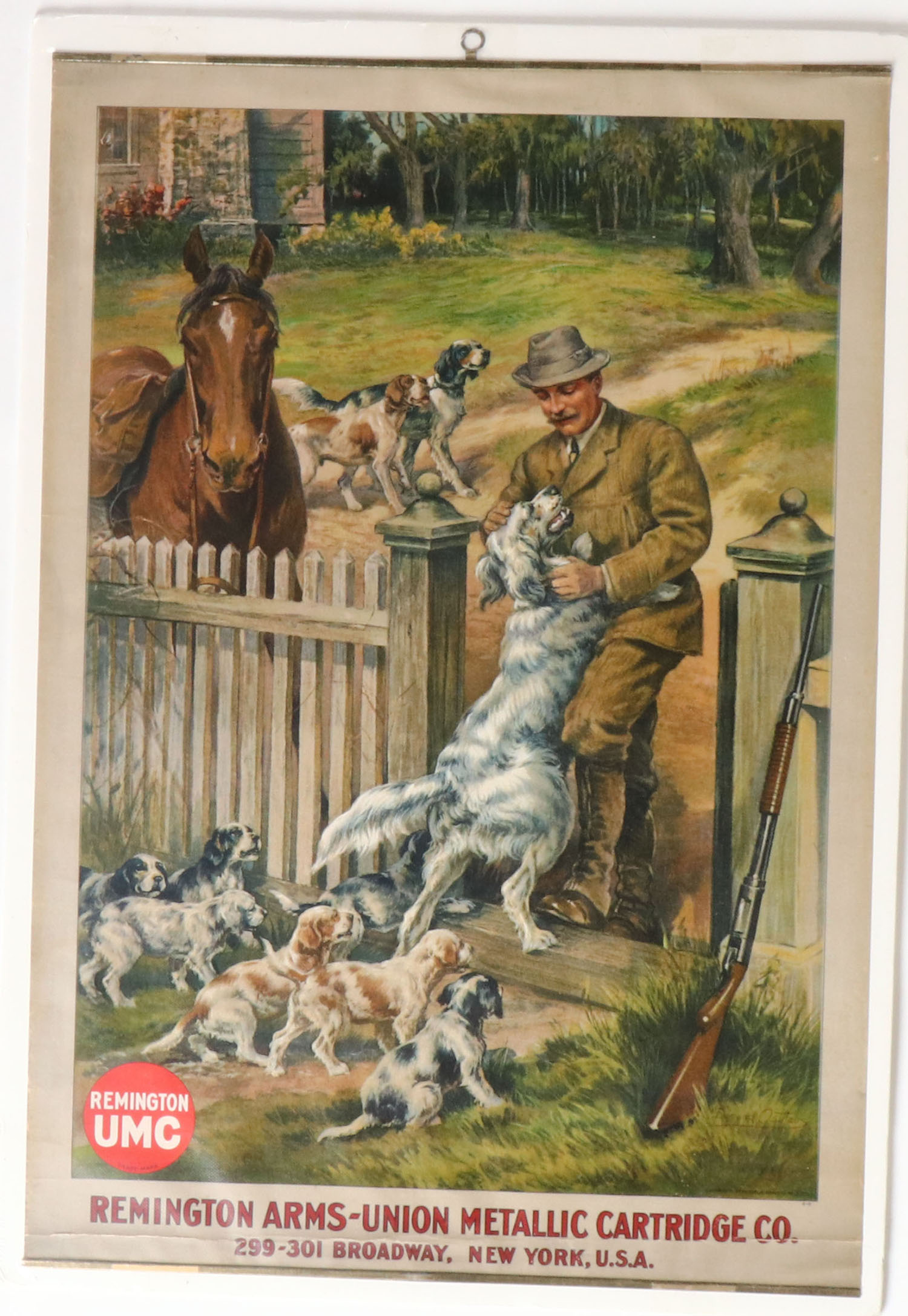 Remington UMC Poster, pictures hunter returning home with a pump shotgun & greeting his dog with a litter of puppies, has near perfect colors with no edge wear, only a crease at bottom, has metal bands top & bottom with brass hanger, 17'' x 25''. Very Hard to Find! Grade: Excellent + - Value: 1000 to 3000