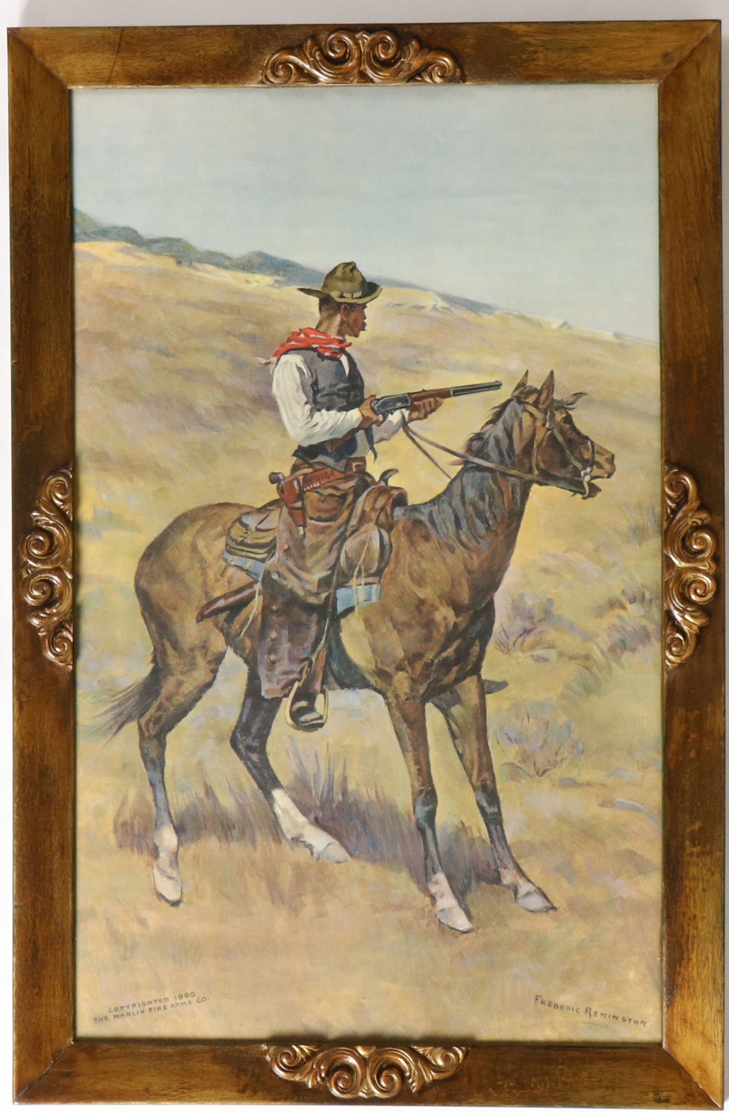 Marlin Firearms Co. Poster by Frederic Remington, pictures hunter on horse back with rifle, dated 1900, no bands, has great colors with no wear, 16 3/8'' x 26 1/4'', framed. Grade: Excellent - Value: 500 to 1500