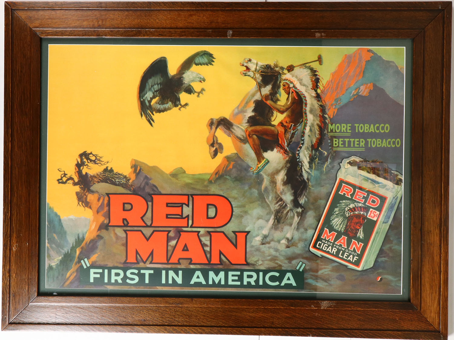 Large RED MAN TABACCO Poster, ''RED MAN FIRST IN AMERICA'', ''MORE TABACCO, BETTER TOBACCO'', pictures Indian in full head dress on horseback fighting a Bald Eagle in flight, 39'' x 27'' image size, framed. Grade: Excellent ++ - Value: 50 to 500