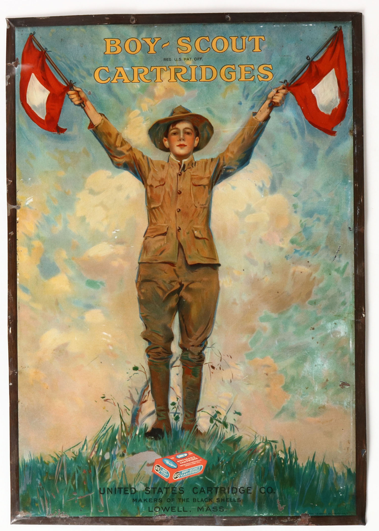 VERY RARE U.S. Cartridge Co. metal advertising sign for the BOY-SCOUT .22 box, Lowell, Madd, this self-framed metal sign pictures young boy scout hold two flags with the RARE .22 boy below, This is the box U.S. Cart Co. got sued by the Boy Scouts of America & had to remove all boxes from the shelfs & re label as SCOUT, circa 1915-1925, sign shows some edge wear with fantastic colors, 13 1/4'' x 19''. Grade: Very Good ++ - Value: 500 to 2000
