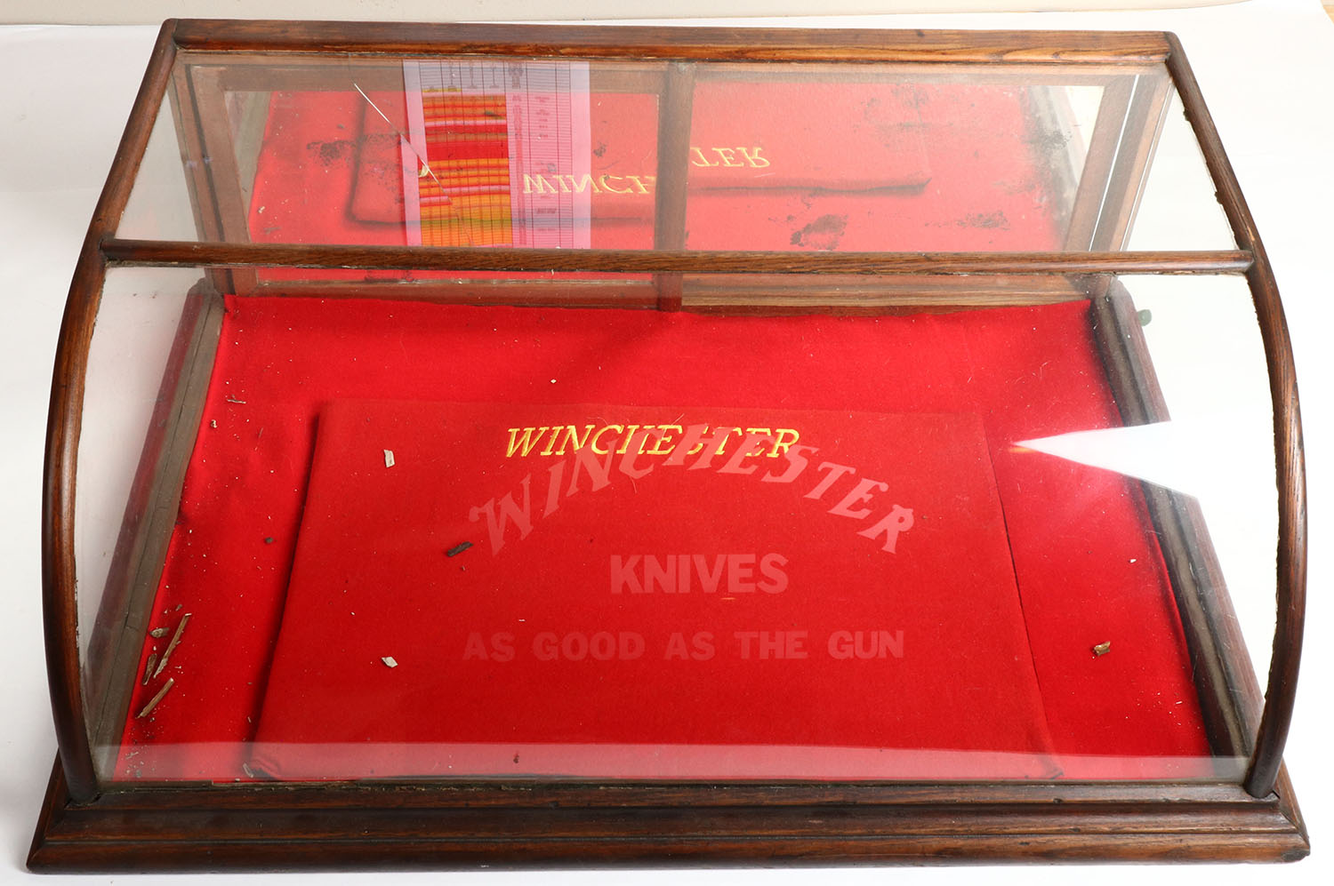 Rare Winchester CURVED GLASS/OAK Knife Display Case, ''WINCHESTER KNIVES AS GOOD AS THE GUN'', etched on glass, 36'' x 23'' X 13 1/2'', appears to be in good shape with one hair line crack to top glass piece, these were only offered to dealer for a short time & then discontinued. Very Rare & Hard To Find! Grade: Excellent - Value: 1000 to 5000