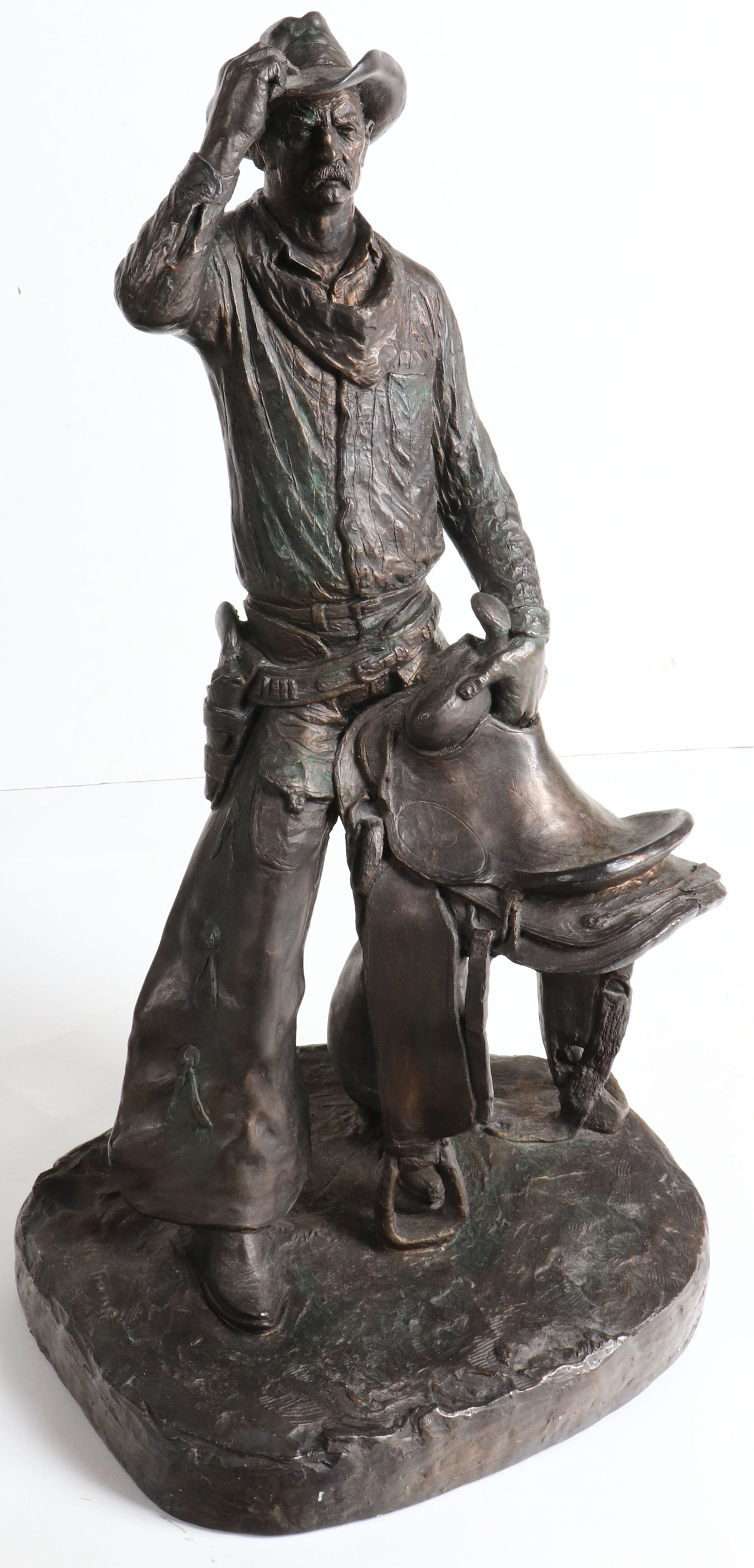 Bronze ''DRIFTER'' by Michael Garman 1968, 1972 4th, wonderful detail of cowboy holding saddle, 11'' x 21 1/2'' x 10'', signed on base. Grade: Excellent ++ - Value: 300 to 1000