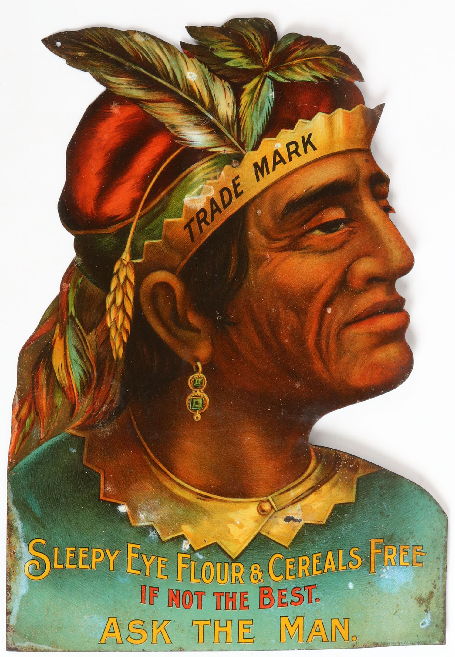 Early Metal advertising sign promotes ''Sleepy Eye Flour & Cereals Free, If Not The Best. ASK THE MAN''., pictures Native American with wonderful colors, shows some edge wear, has wire easel back, 10'' x 13 1/2''. Grade: Excellent - Value: 100 to 1000