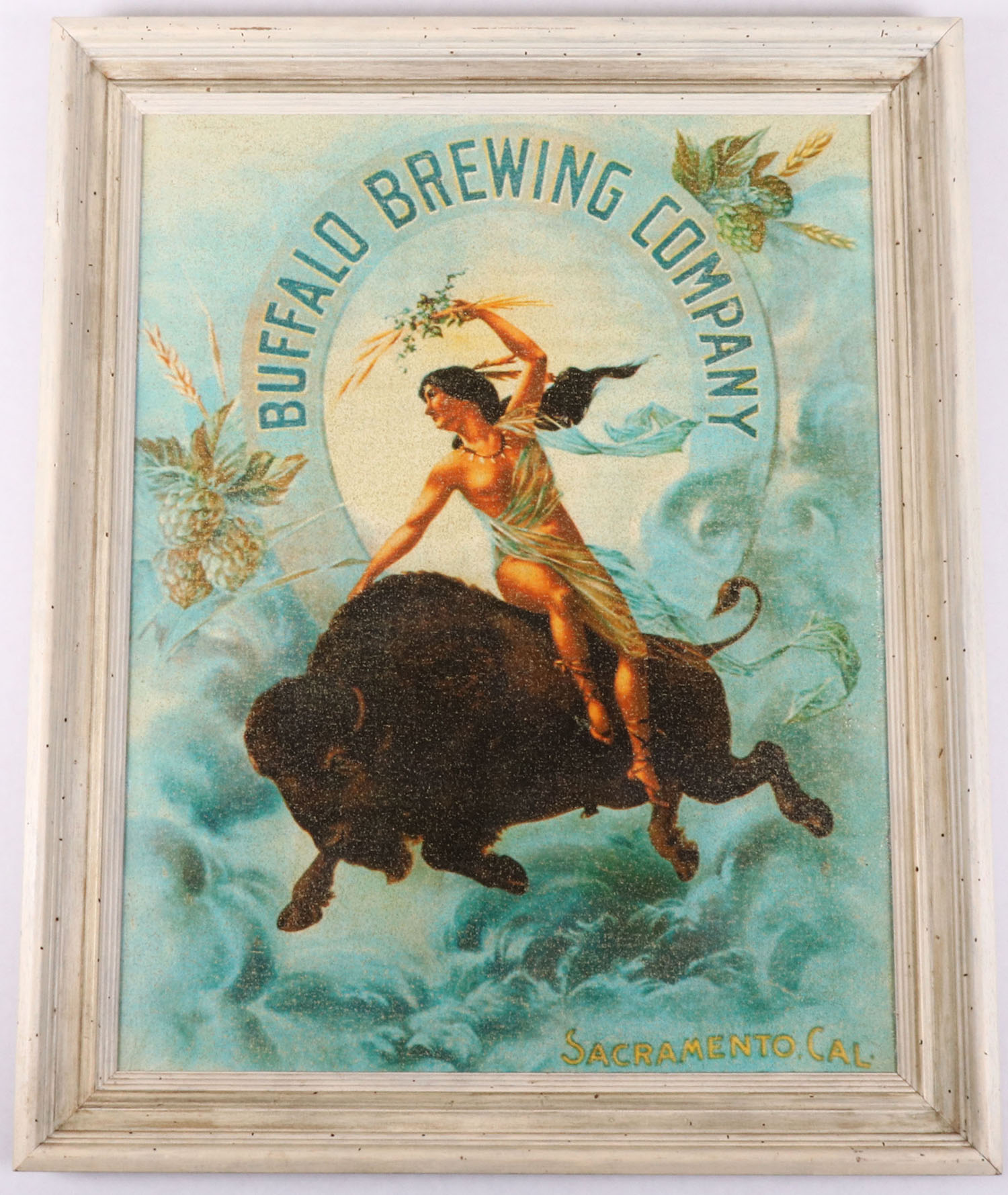 Buffalo Brewing Company Sacramento, Cal, print on board, nice early image of lady riding a bison, 21 1/2'' x 27 1/2'', framed. Grade: Excellent - Value: 50 to 250