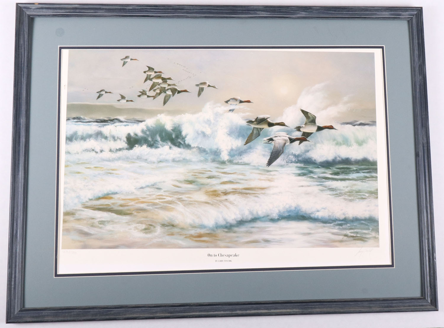 Larry Toschik Print ''ON TO CHESAPEAKE'', pictures canvasbacks in flight over ocean waives, 25'' x 16'' image size, 4475/5300, framed no glass. Grade: Excellent - Value: 10 to 100