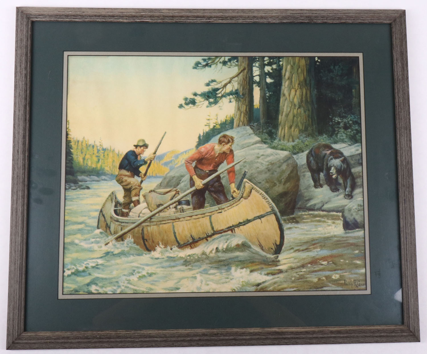 Philip R Goodwin Print ''Adventures on the Nipigon'', pictures two hunters in birch canoe floating the river and a bear on shore ready to attack, 20'' x 16'' image size, framed and matted. Grade: Excellent - Value: 100 to 250