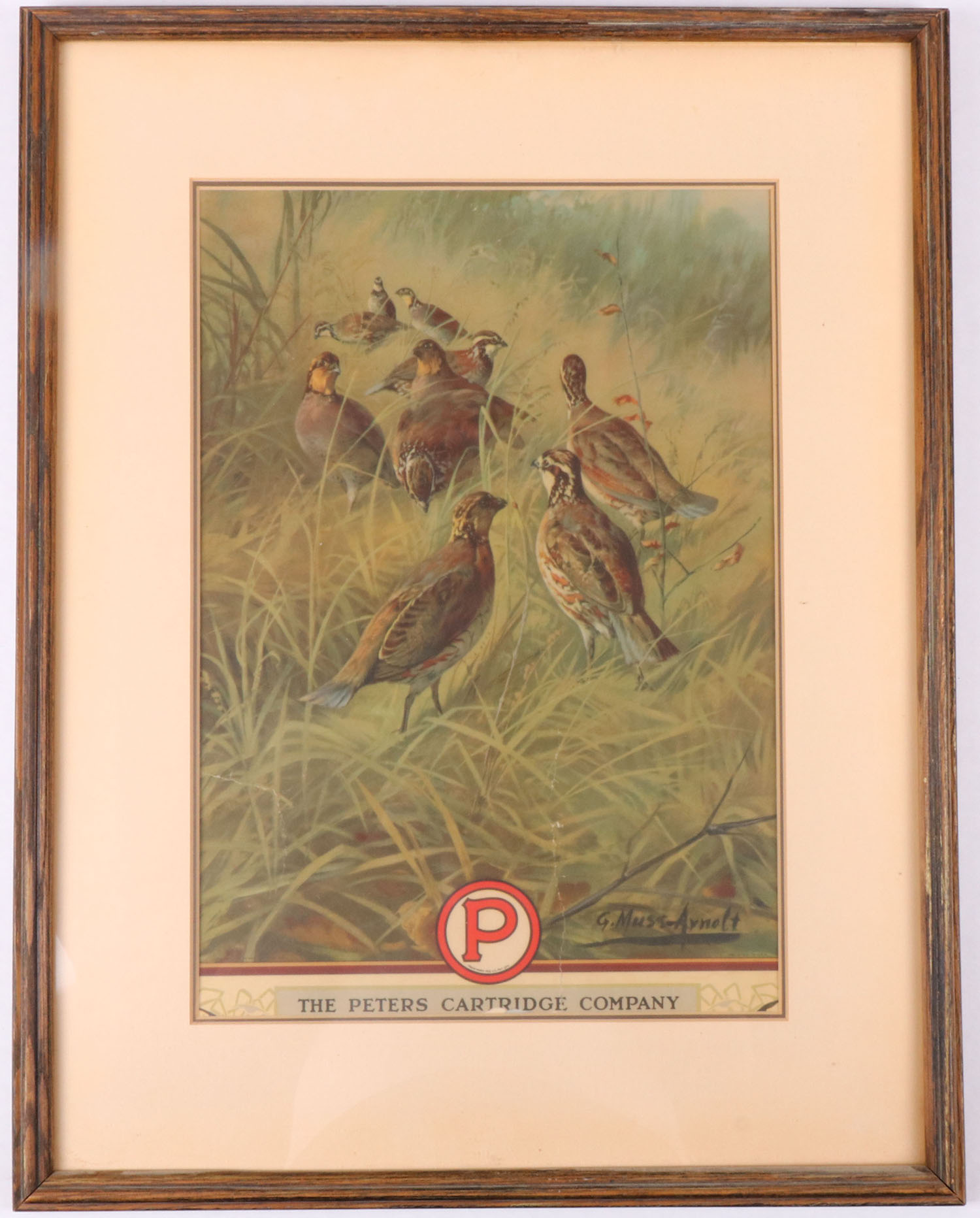 1926 Peters Calendar top by G. Muss Arnolt, pictures nice covey of quail in march grass, has a tear to center, 12 1/2'' x 18'', framed & matted. Grade: Very Good ++ - Value: 50 to 300