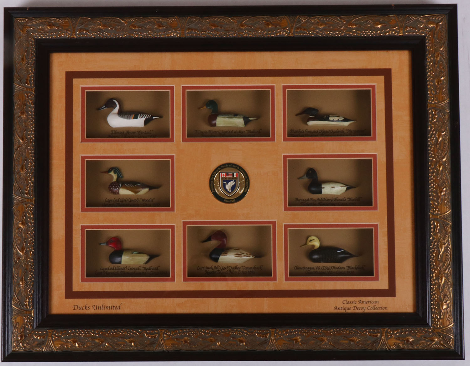 DU Hand Carved decoys, Classic American Antique Decoy Collection'', each decoy is hand carved & pained, each on is labeled in a shadow box, framed, 31'' x 24''. Grade: MINT - Value: 600 to 1200