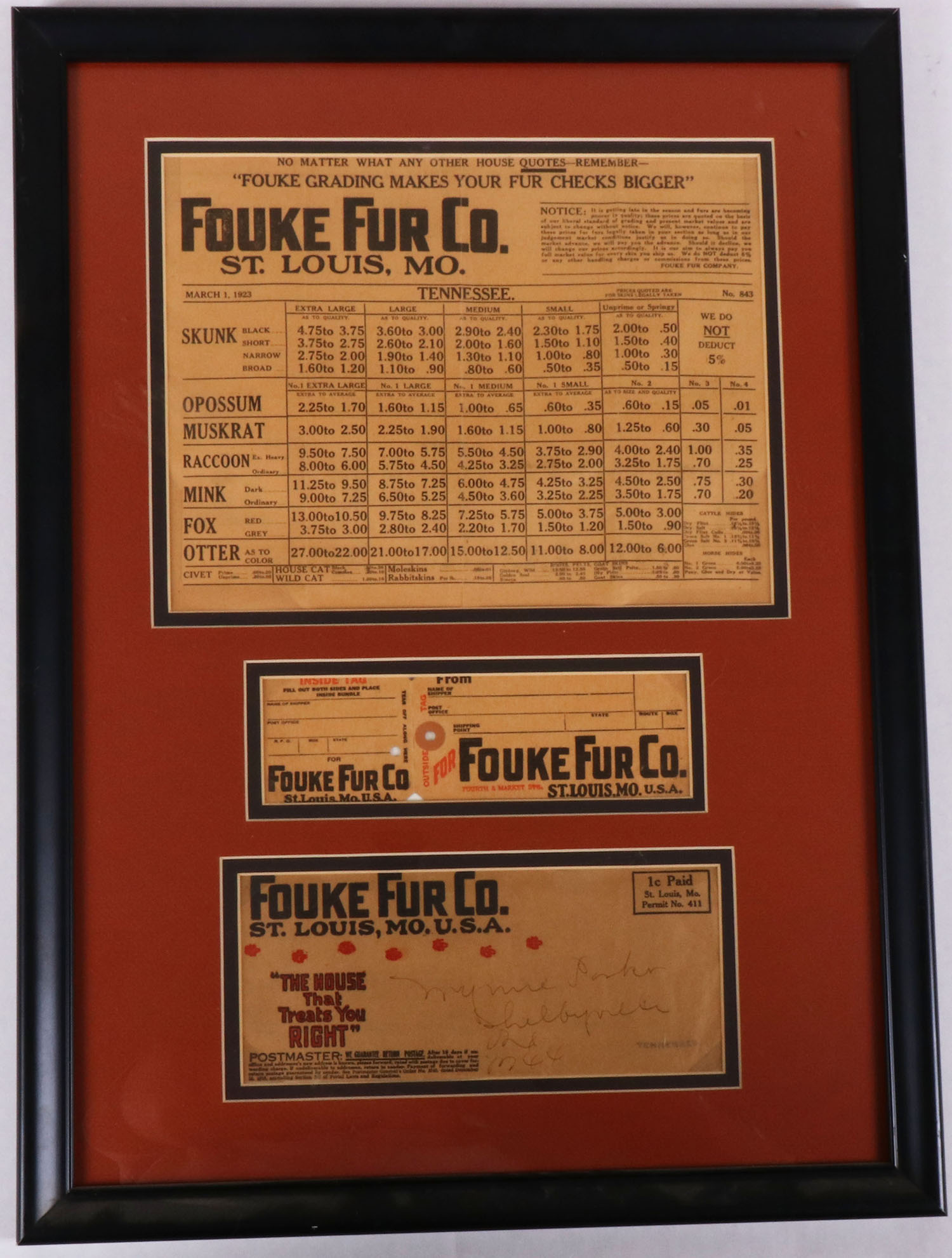 Fouke Fur Co. Envelope, tag & price sheet, framed, 17'' x 23''. Grade: Very Good - Value: 2 to 30