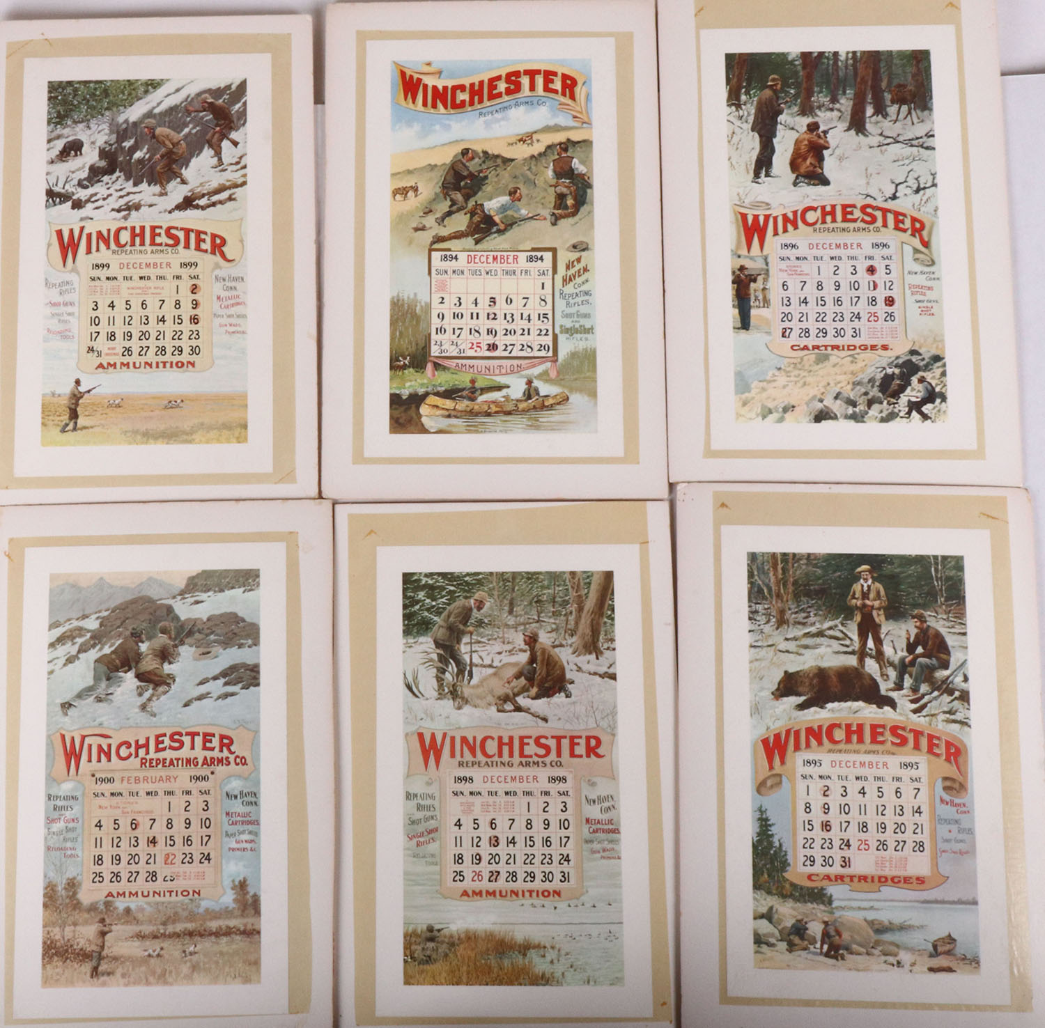 Lot of 6 Winchester images of early calendars, 10'' x 17''. Grade: Excellent ++ - Value: 10 to 50