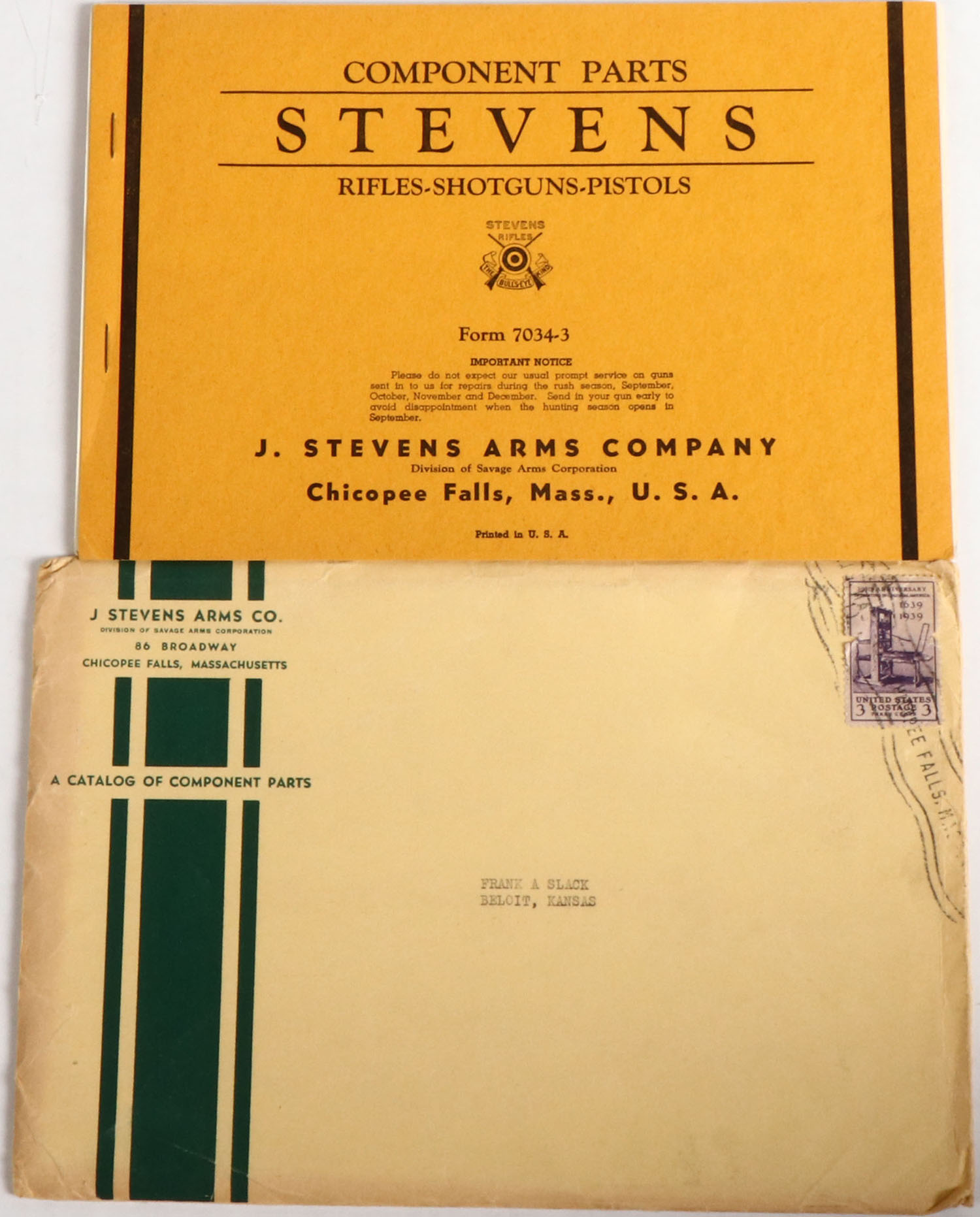 1939 J. Stevens Arms Co. Component Parts Price List, Rifles, Shotguns & Pistols, all models with complete parts breakdown are pictured, about 35 pages, has original mailing envelope, 9'' x 6''. Grade: Excellent - Value: 6 to 50