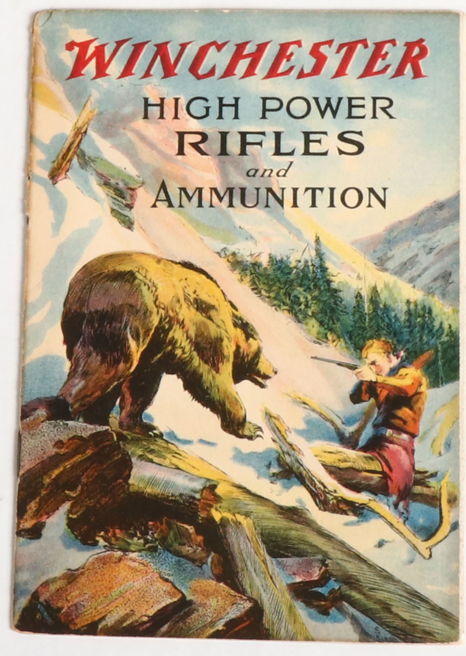 Winchester High Power RIFLES and Ammuntion booklet, pictures a full color image of hunter shooting at a bear in snow scene, 12 pages, 4'' x 6'', shows a tear to binding. Grade: Very Good ++ - Value: 40 to 200
