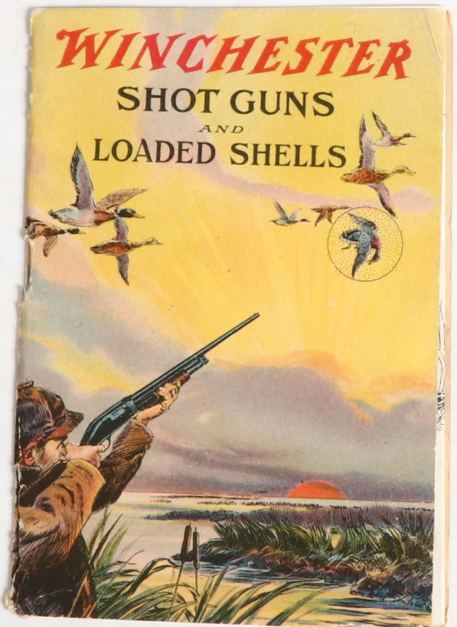 Winchester Shot Guns and Loaded Shells booklet, pictures a full color image of a duck hunting scene with mallards in flight, 12 pages, 4'' x 6'', shows a tear to binding. Grade: Very Good ++ - Value: 40 to 200